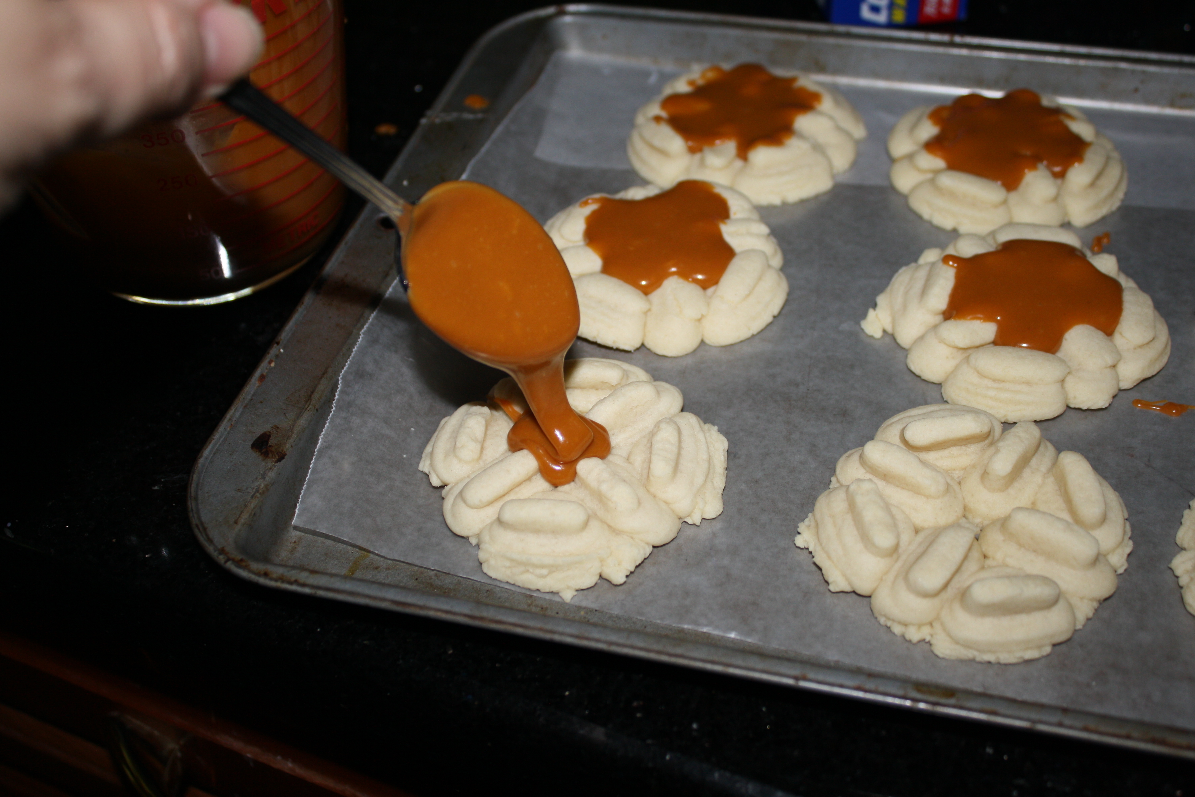 Once the mixture was thick and smooth, I put dollops onto the cookies. These were laid out on a cookie sheet with wax paper, so that they could be chilled (and the icing hardened) in the refrigerator. (That’s what I use the unoccupied shelves my wine cooler for, actually.)