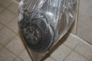 Our shower head isn’t like the one in the photo, in fact, it’s a hand-held, not that we have used that feature often, but it sits in its bracket upside-down, so already I had a challenge. When I put the plastic baggie over it, a lot of the water-vinegar mixture leaked out. I had to take it out of the bracket and let it hang there while it soaked. Also, the original blogger said that you can use rubber bands to secure the bag, but that was a little awkward to get around the full bag, and even more water squirted out during the process.