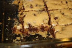 I didn’t want to overcook them or risk burning the chocolate chips. As you can see in the photo, the edges were brown, and they appeared to be done. They cooled on a wire rack for about 20 minutes before being cut, and that’s were the proof came out…in the form of a pudding-like substance.