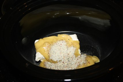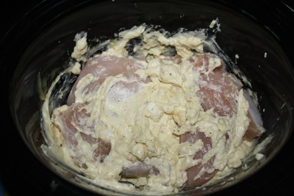 I set the cream cheese out for about half an hour as the recipe called for, and then put it into the crock pot with the cream of chicken and Good Seasons packet. Right off the bat, I had some reservations. I don’t really like to cook with canned soup, but once in a while, you get lazy and just go with it. It was impossible to find cream of chicken at my local market that was made by any company other that Campbell’s, so I chose the low-sodium (Healthy Requests) option. Also, I’ve worked with cream of chicken before, and had concerns was that the dish was going to end up a little bland, but I figured that the cream cheese and Italian seasoning might even that out with a little tang.