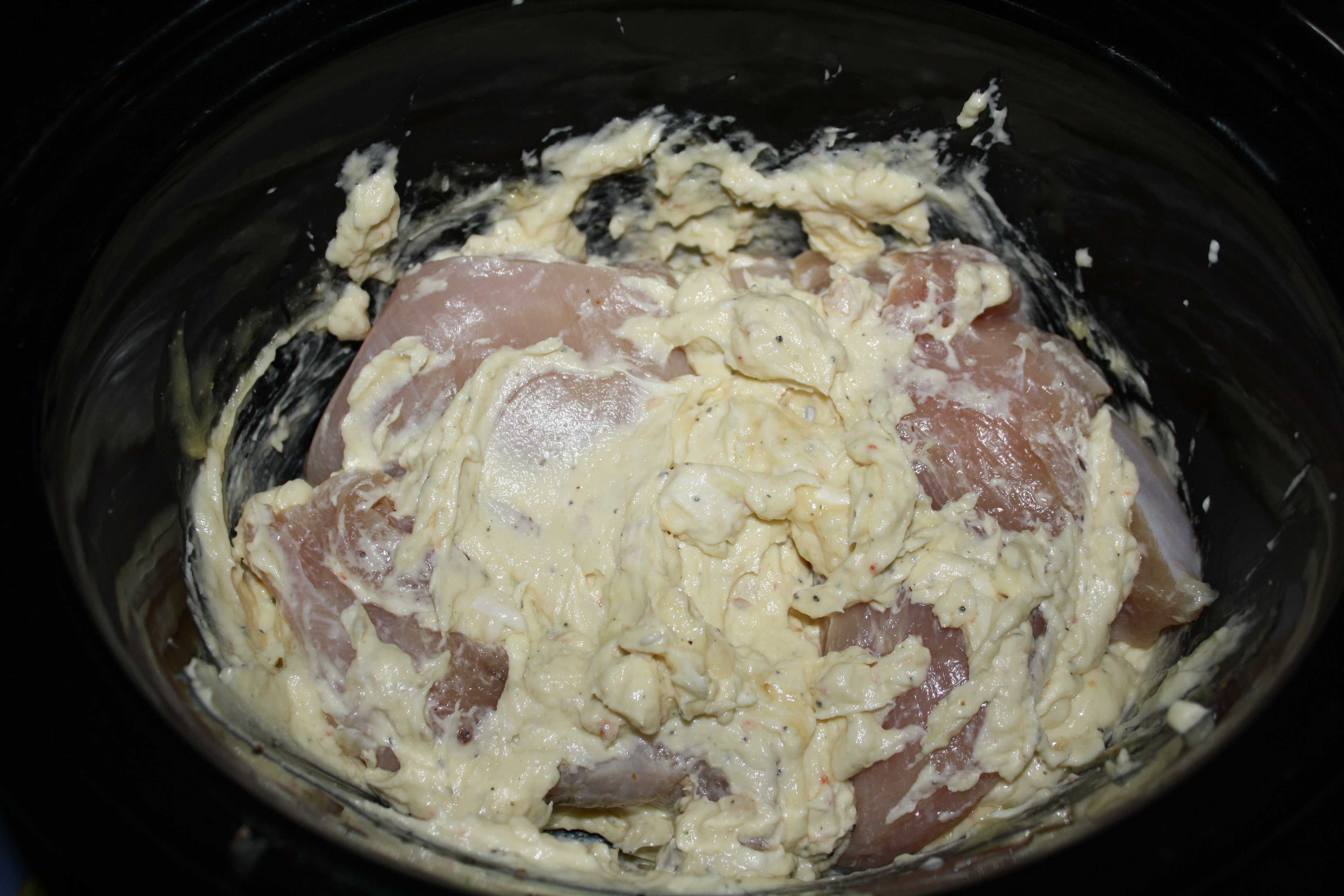 After 20 minutes, I got tired of waiting for the cheesy soup goop to liquify, and just threw in the bird. I used three breasts, about 2.5 lbs in all.