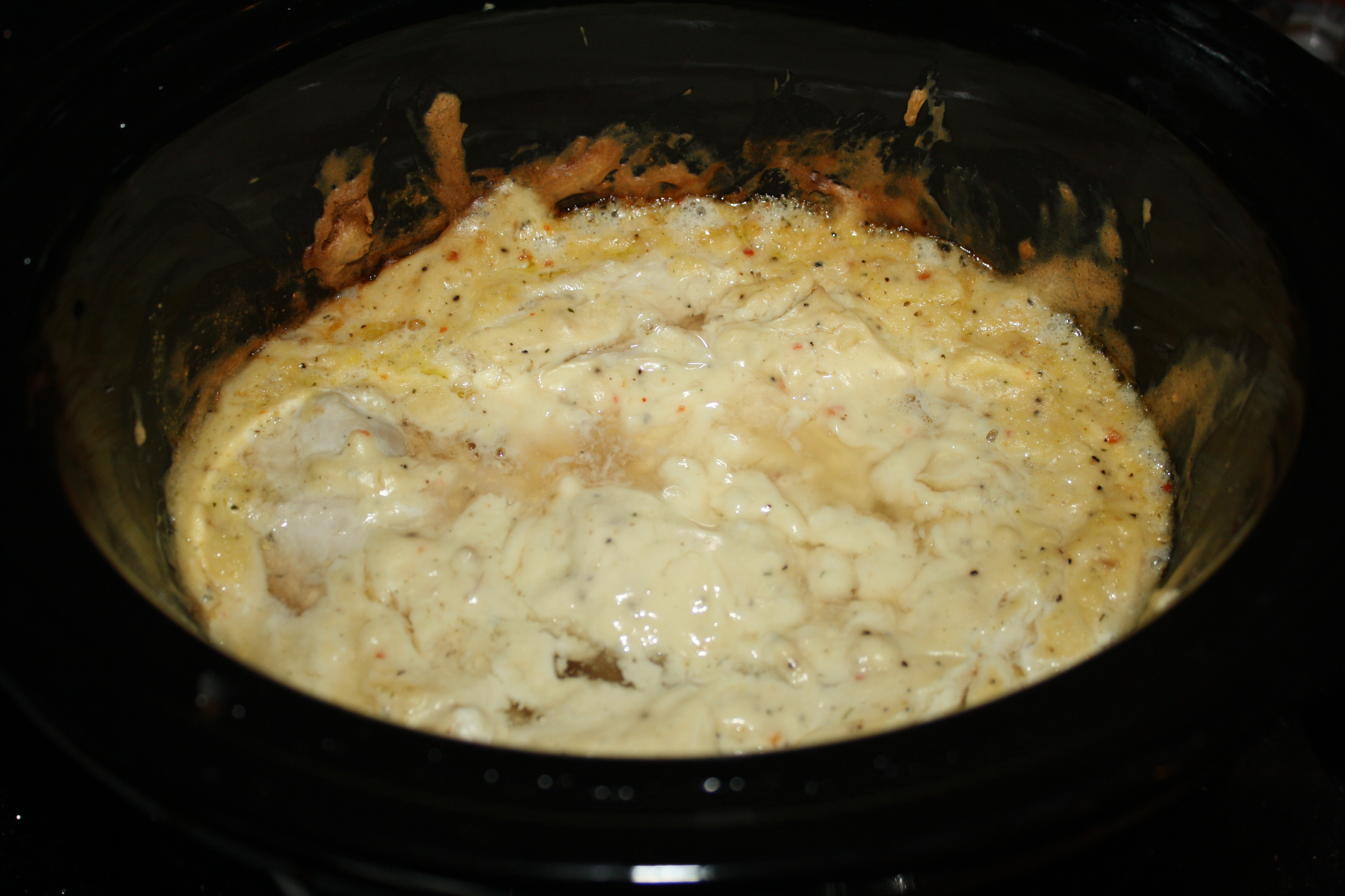 The concoction, at first, seemed reluctant to melt, but after about 20 minutes, I put in the chicken. I did not use frozen chicken as the recipe called for because the chicken I had was already thawed. But you also need to watch with putting frozen chicken in your crock pot because you may risk cracking the thing as thoroughly frozen meets the heated ceramic. Also, if you start with frozen chicken, your dish will take that much longer to cook.