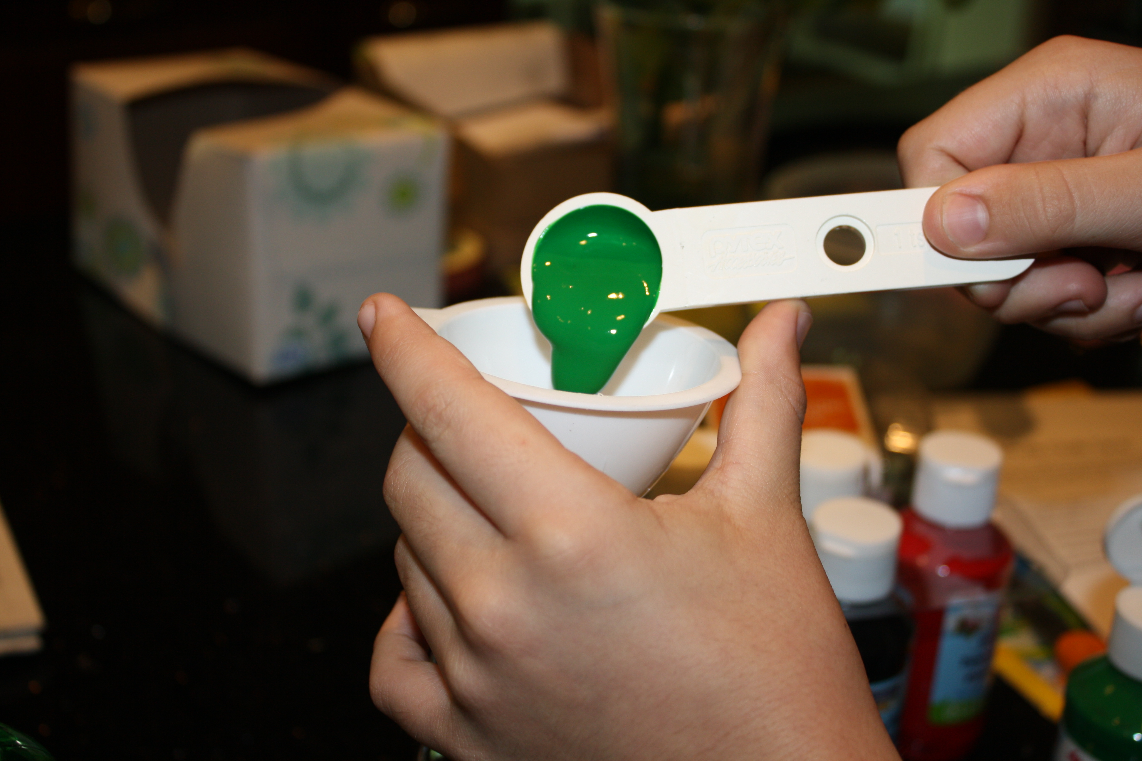 2.   Add one teaspoon of washable tempura paint and a quirt of dishwashing liquid.   Mix well.