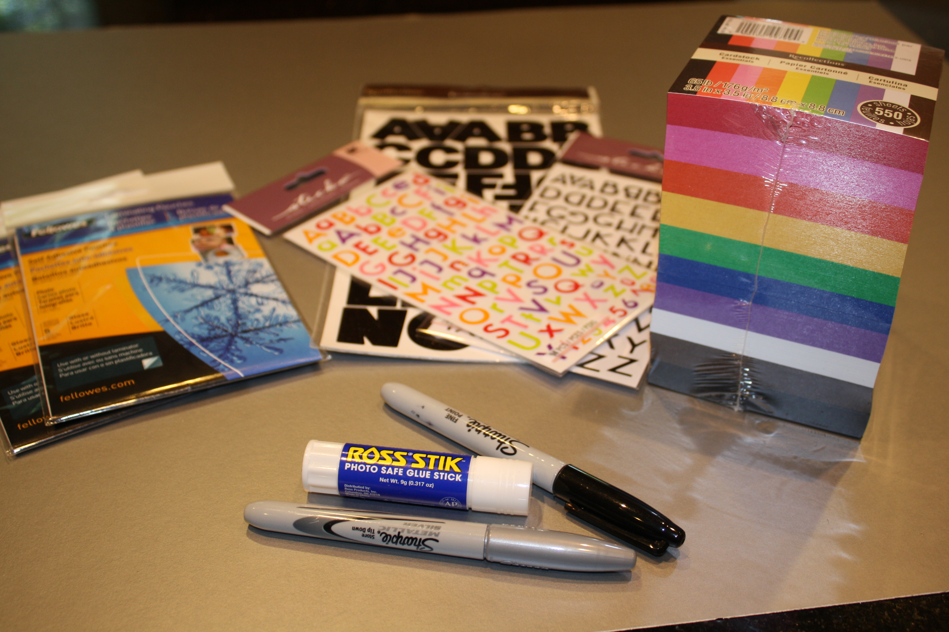 Sharpies, a glue stick, and some decorative ribbon.