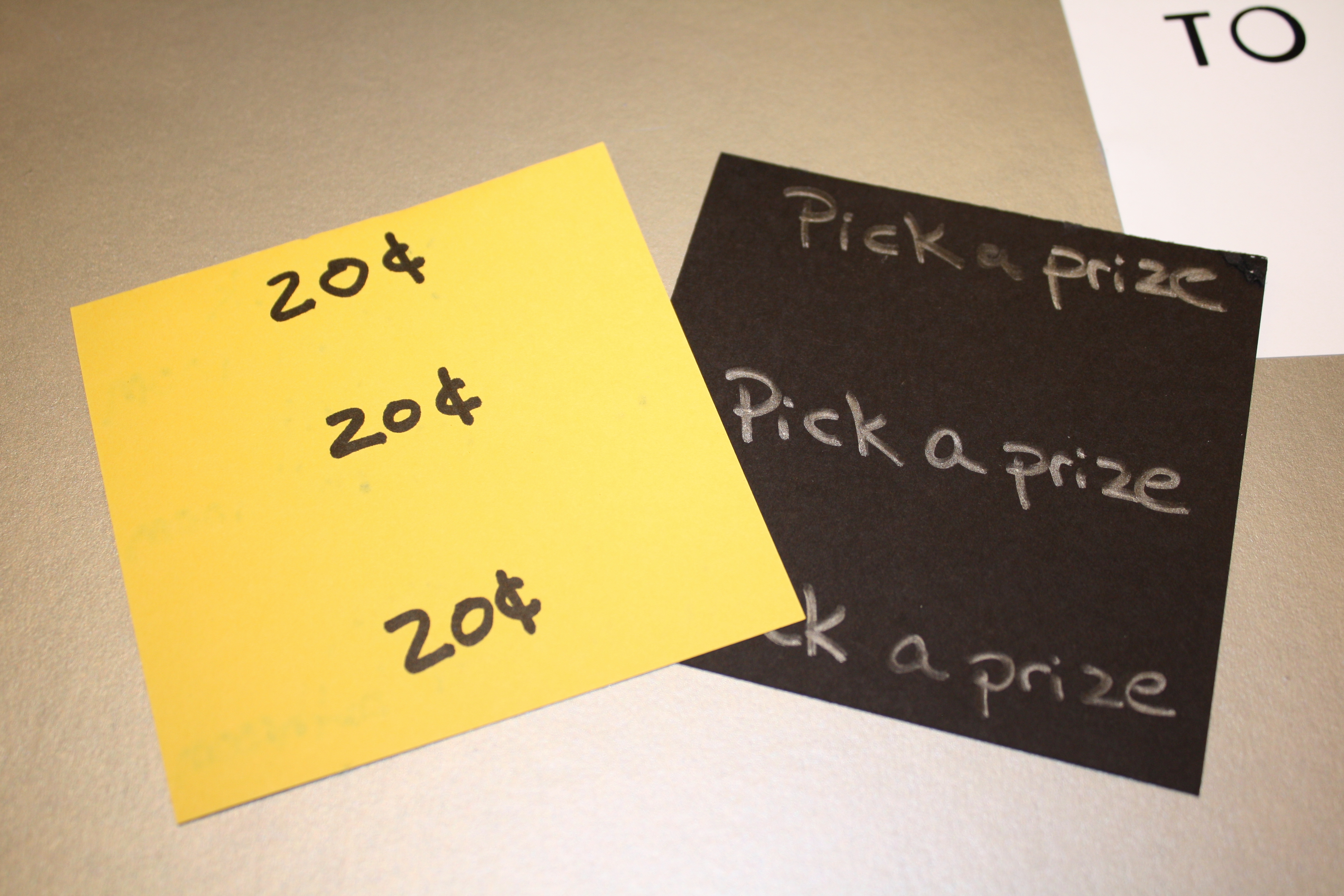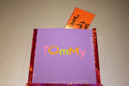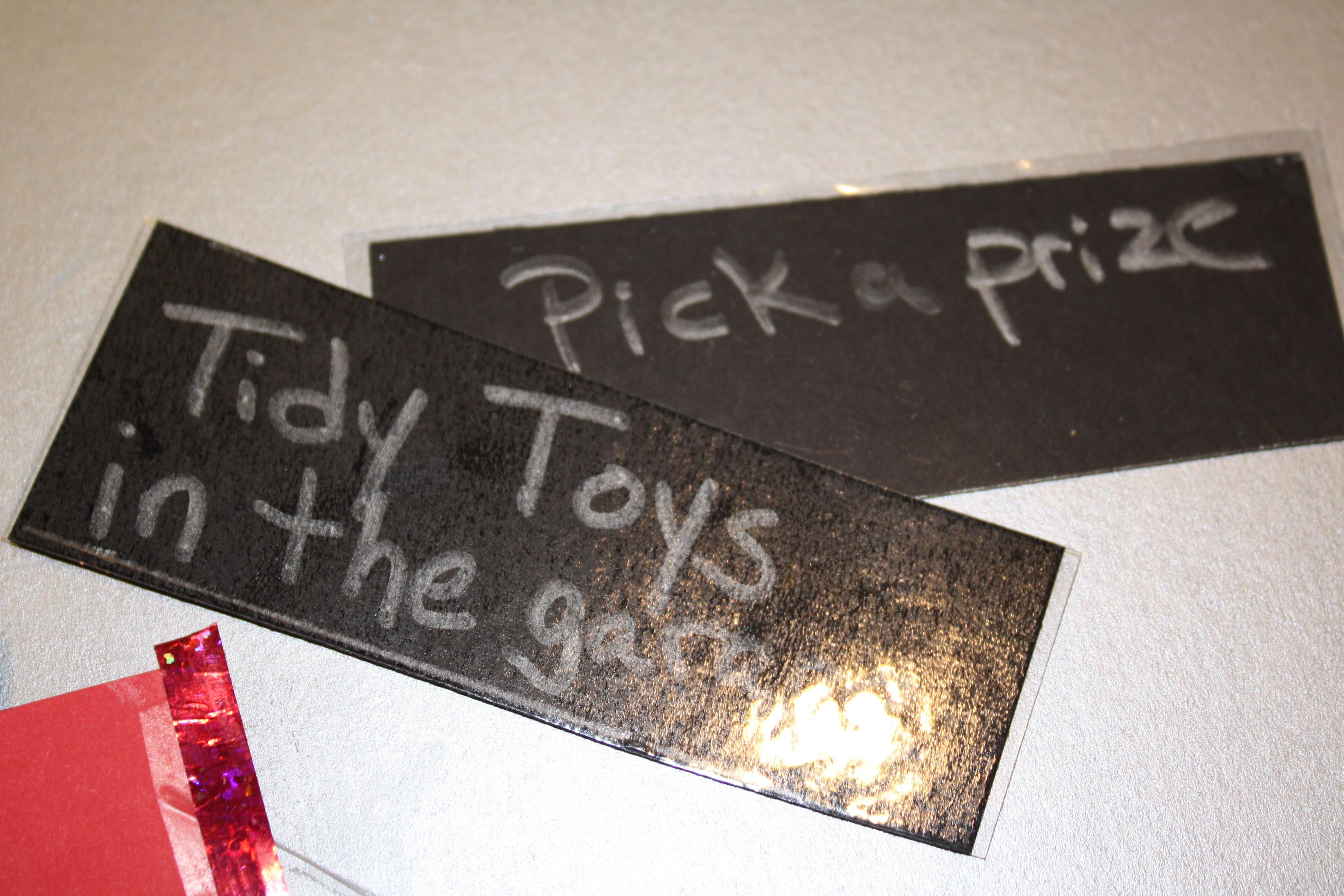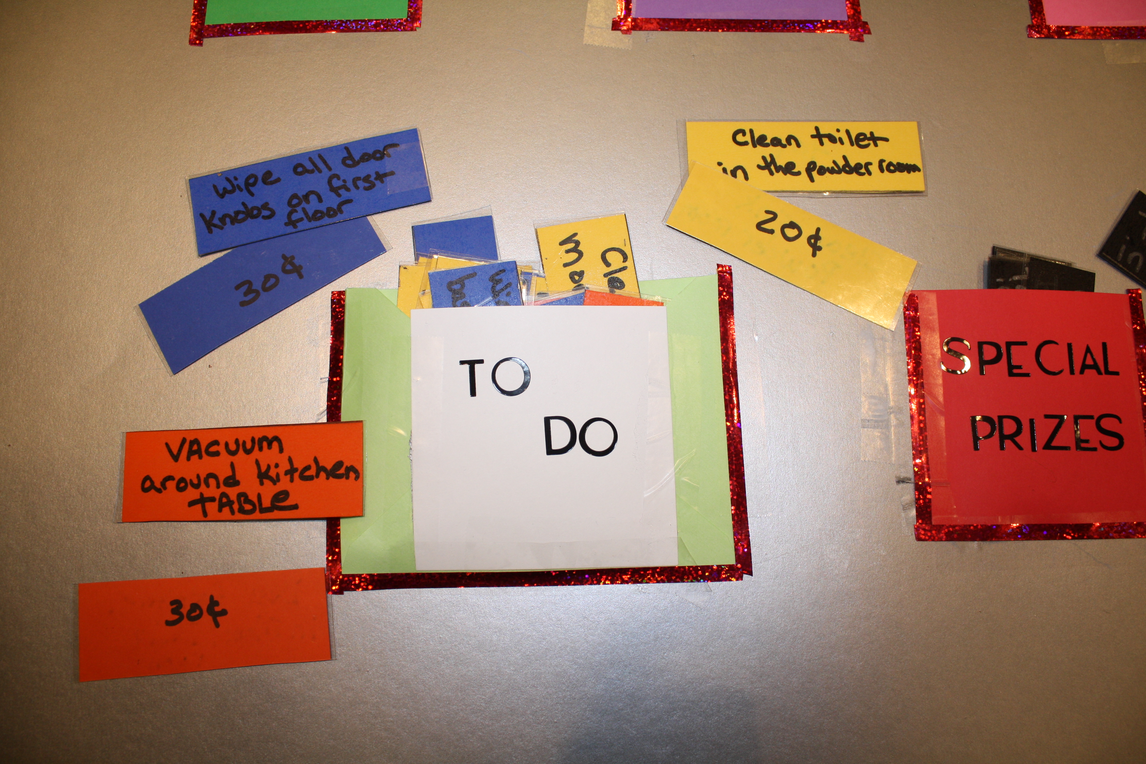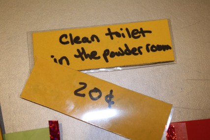 Then I was ready to go. First I put some letters on the poster board to set up the premise, and then I made pockets for each of the kids. Then, I made up the chores, listing a chore on the front and the compensation on the back. In addition to money, there is also a “Special Prize” pocket for more tedious and (for them) challenging tasks. Once they complete these jobs, they can choose from a special prize box, which will be filled with little things I have been collecting from stores like Five Below, and the dollar sections at Michael’s and Target.