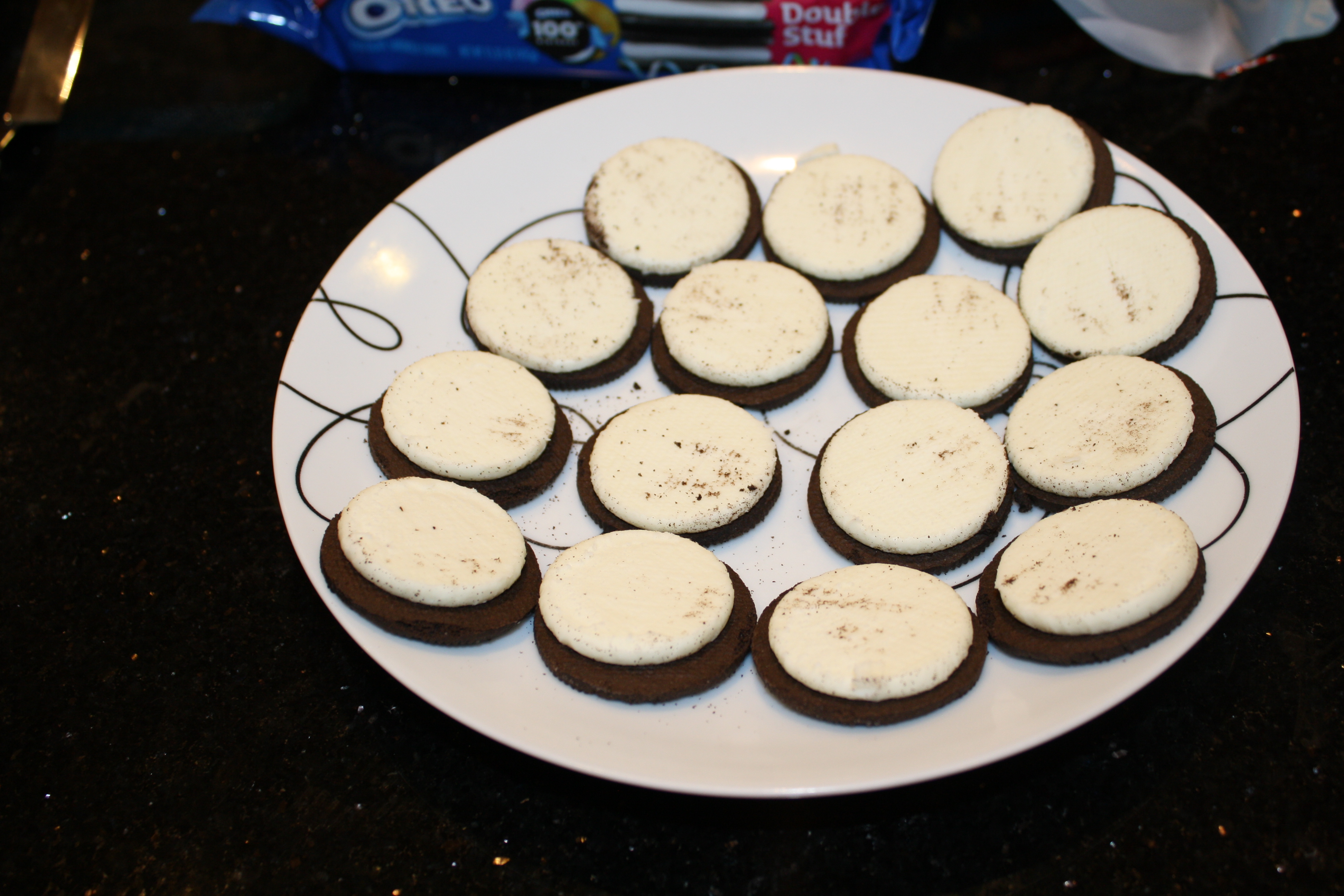 While they were baking, I separated Oreo cookies, saving the unused tops for a later project. I also used a vegetable brush to clean off any excess cookie crumbs from the creamy center.