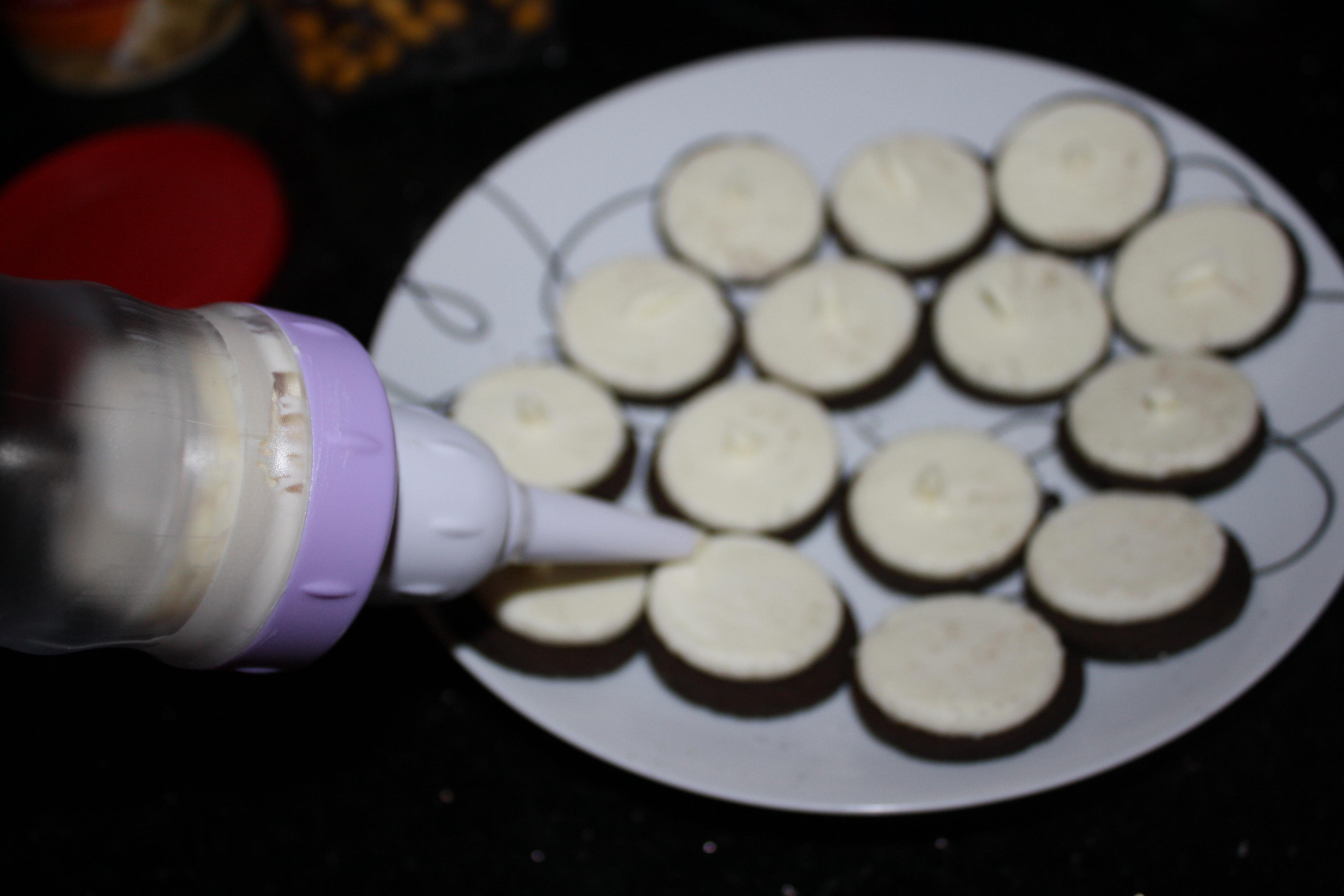 Next, I used an icing press to place a small dollop of vanilla icing in the center.