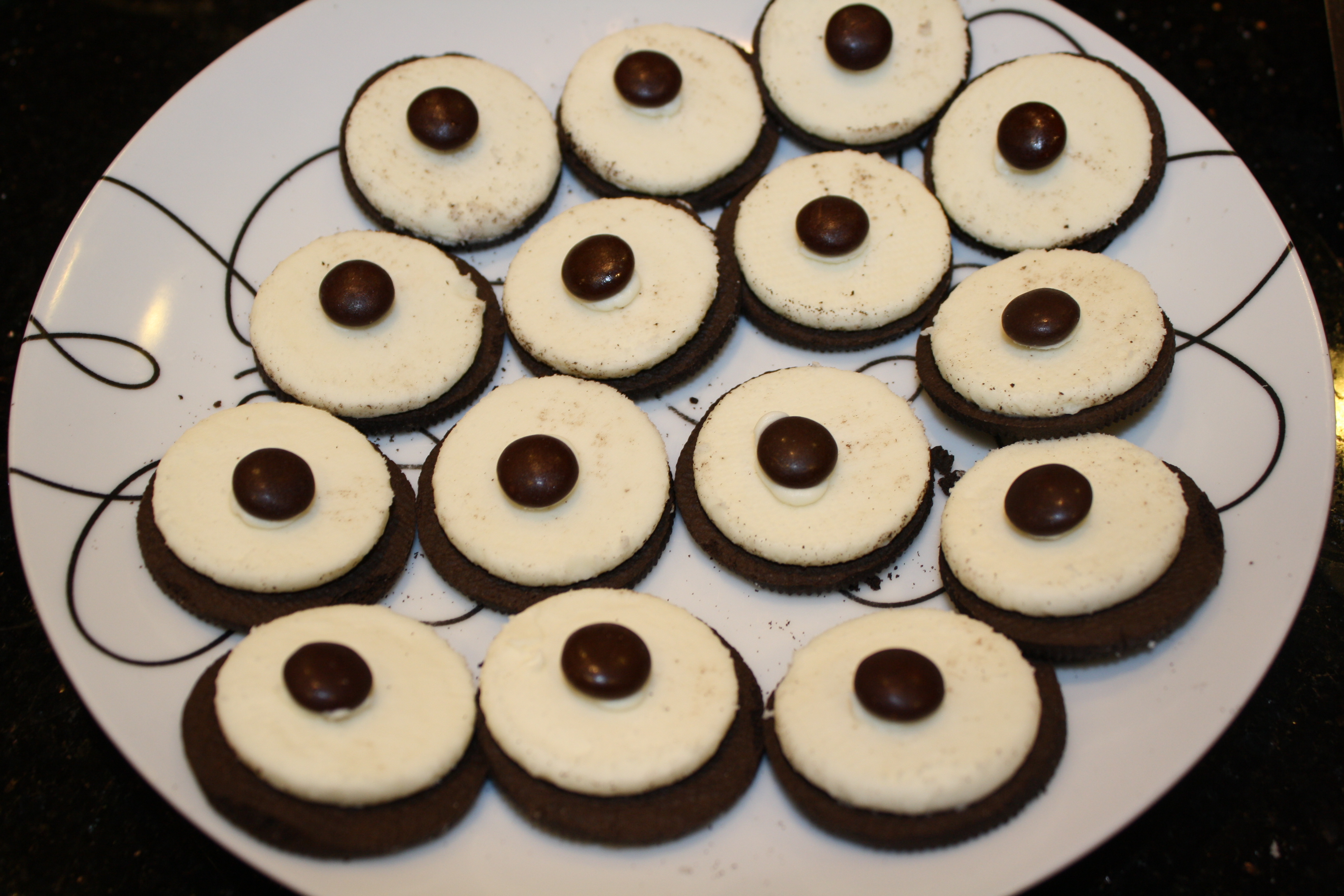 Then, I attached a brown M&M on top of the icing spots.