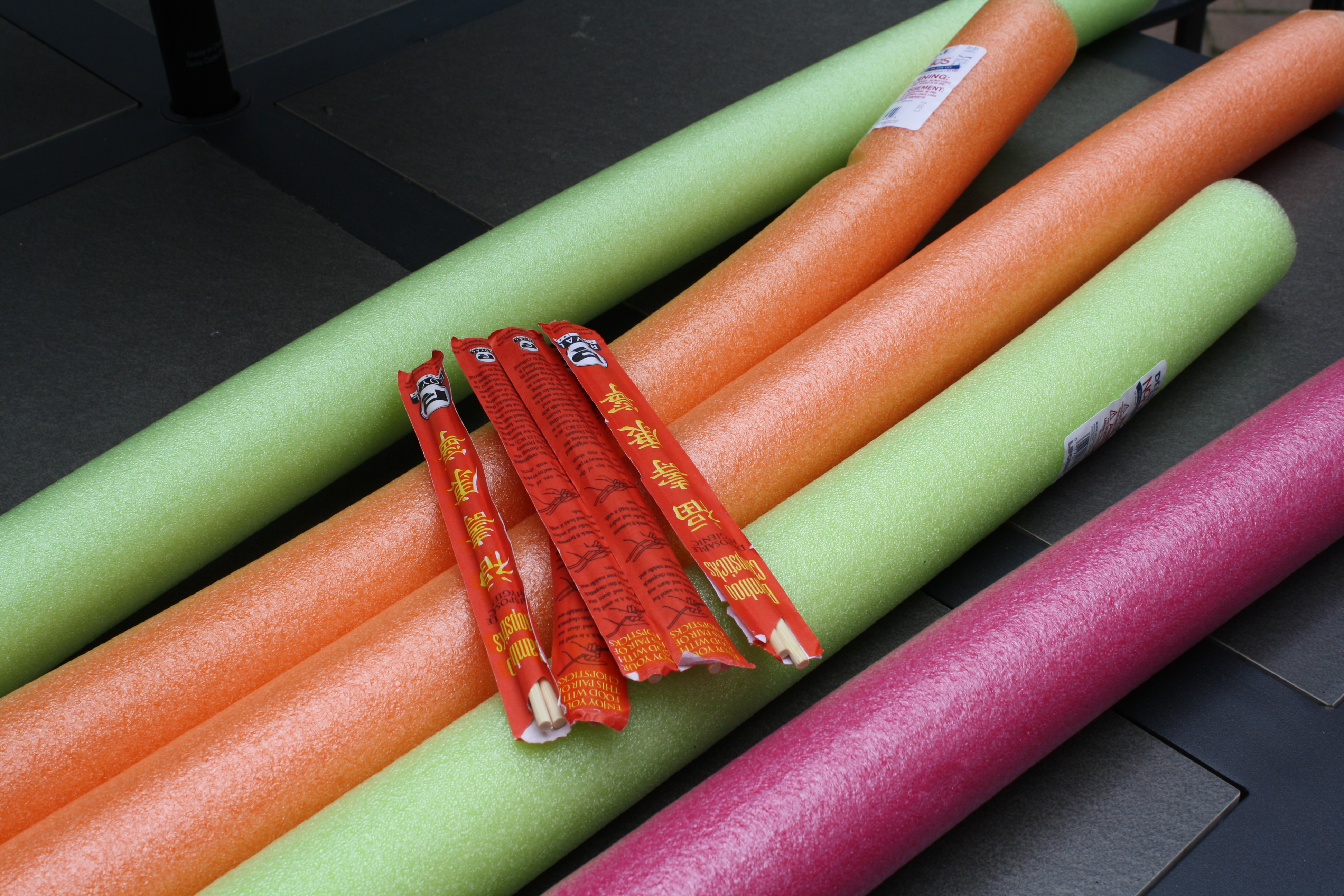 The game was very inexpensive and easy to set up. First I got a few pool noodles from Five Below. Cost: $1 each. Then, while dining recently at a seafood/Asian-fusion restaurant, I kind of lifted more than my share of disposable chopsticks. Mind you, I am not suggesting you should do this, but it saved me from looking all over for chopsticks, and the price couldn’t have been better. I took five pairs, and tipped a little heavier than the usual 15%.