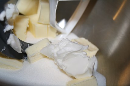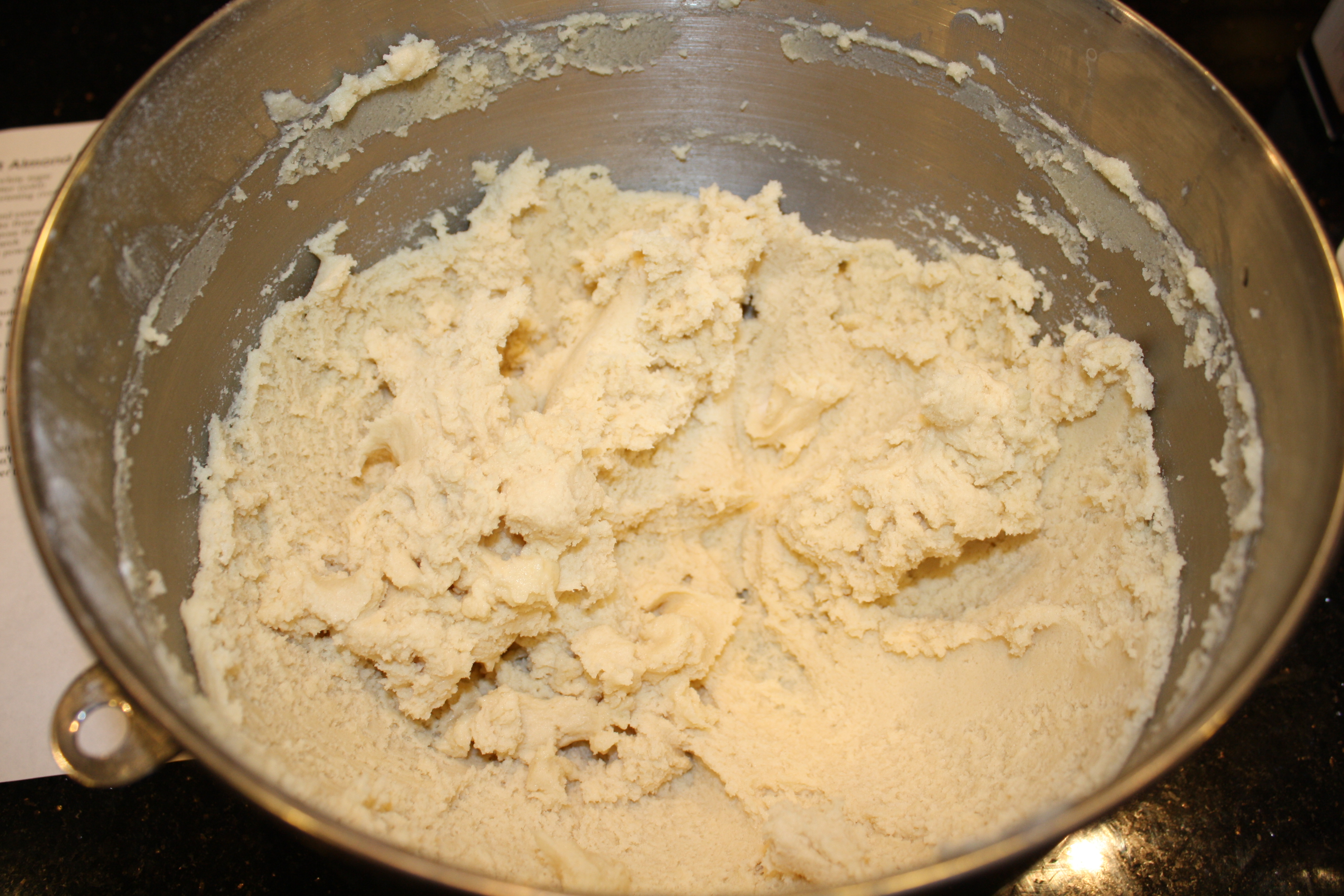 First we put the butter, sugar, and shortening into the bowl and mixed until they were smoothly combined.
