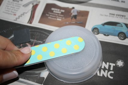 The globe instructions recommended sanding the platform as well as the bottoms of the mirrored tiles, so I did that quickly with an emery board.