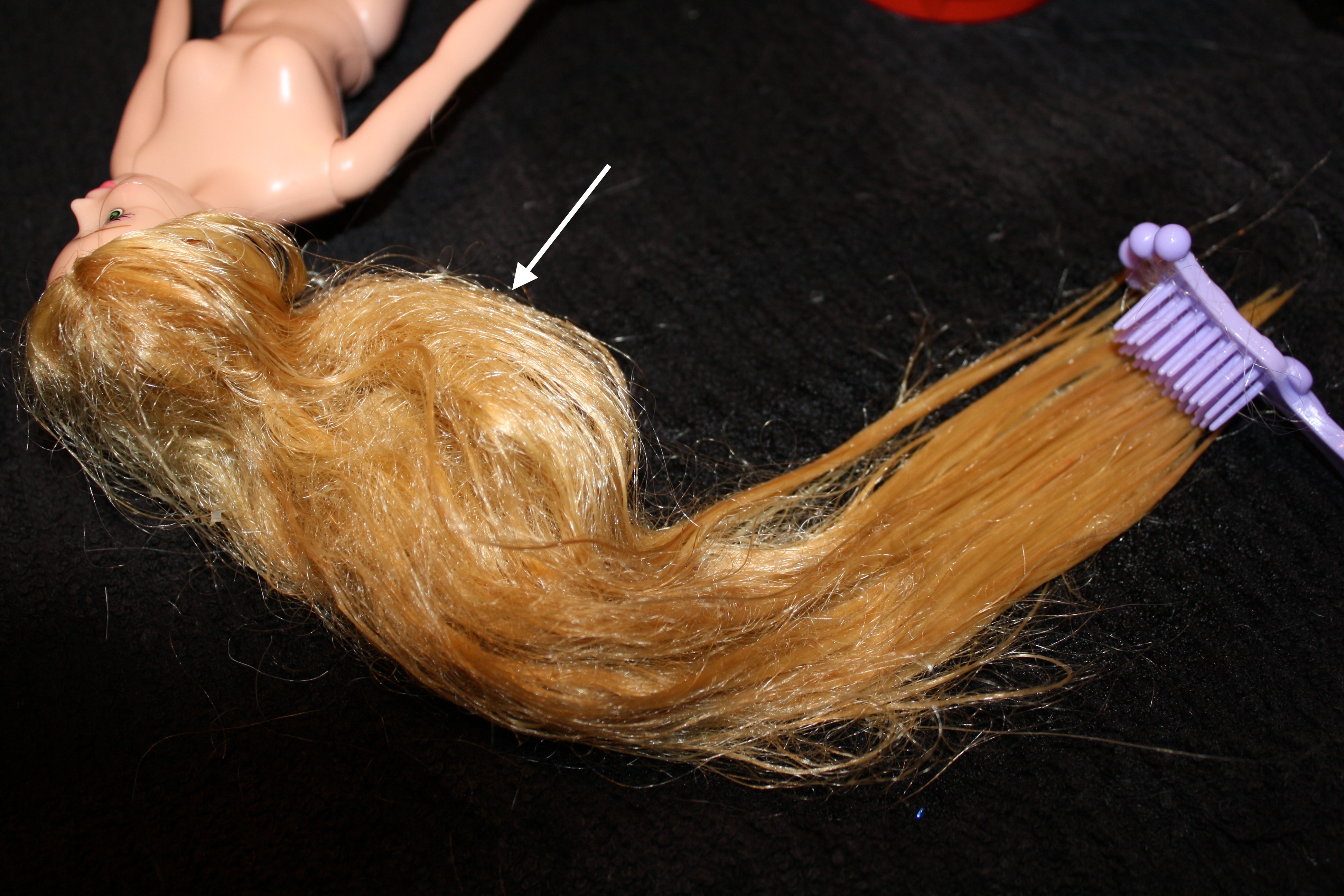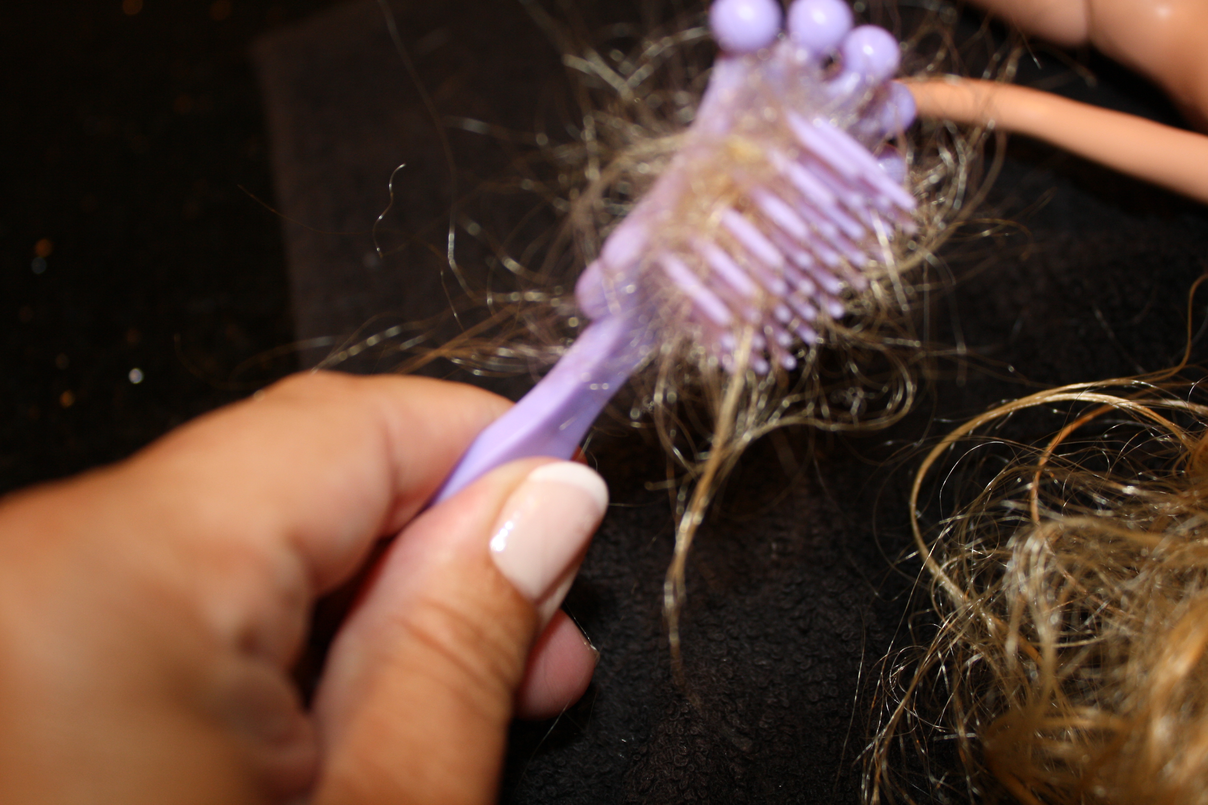 After soaking for a minute or so, I used a Barbie brush to extricate the hair from the tangles.