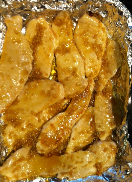 Then the chicken was placed into a casserole dish and the garlic-brown sugar sauce was distributed over the cutlets. The dish went into the oven…but hold on a second! Did you read the temperature in the recipe? Five hundred degrees?? Is the chicken going into an oven or a kiln? I was very wary of the 500 degree idea, so I scaled back the temperature to 350 and baked my chicken for about 20 minutes, until the chicken was cooked all the way through.