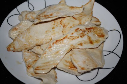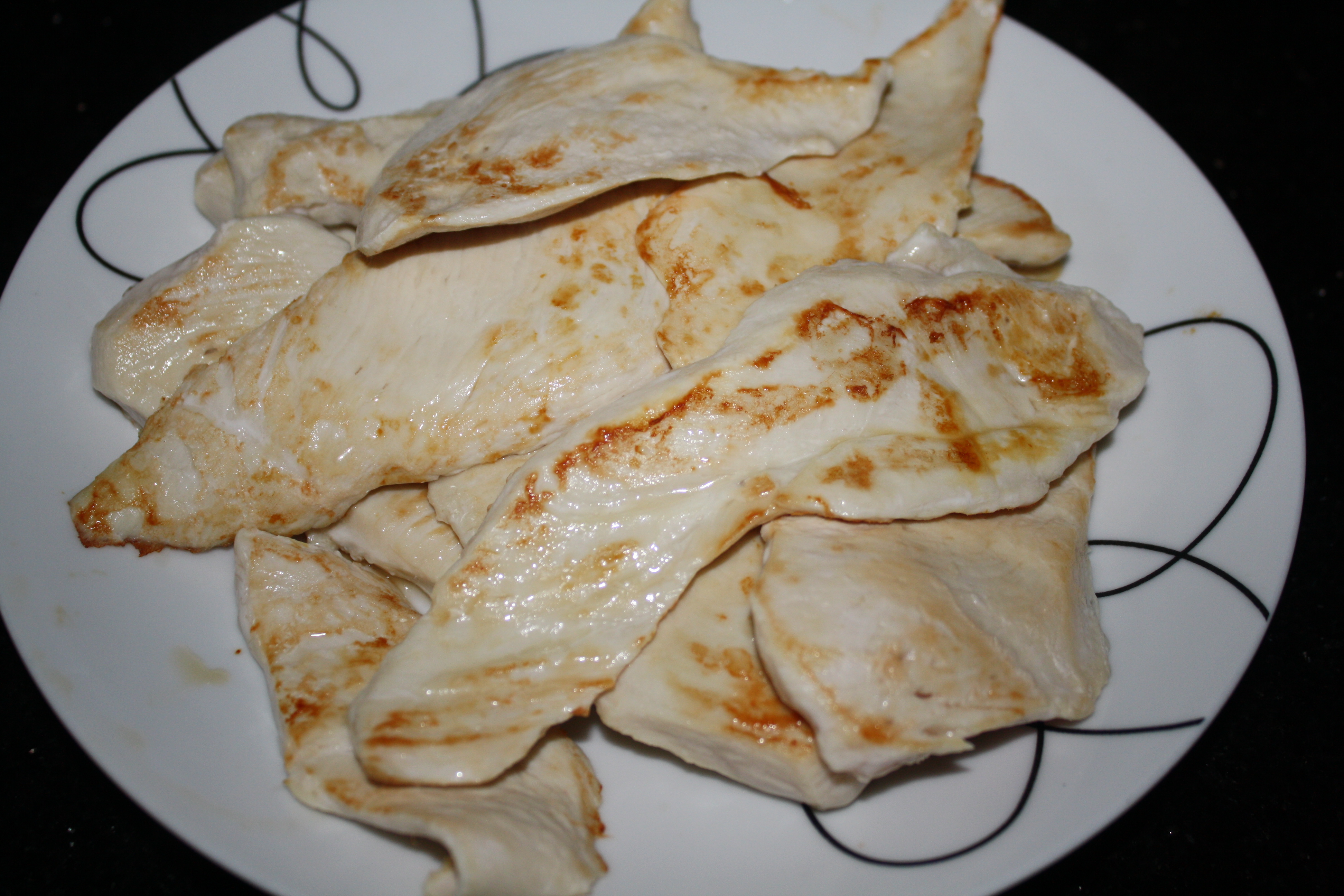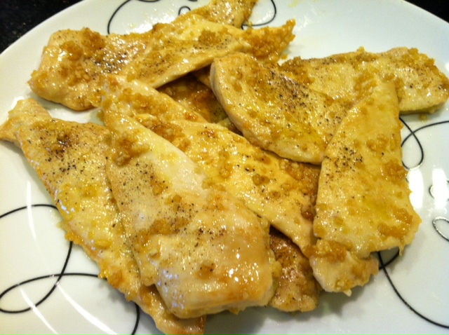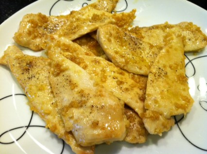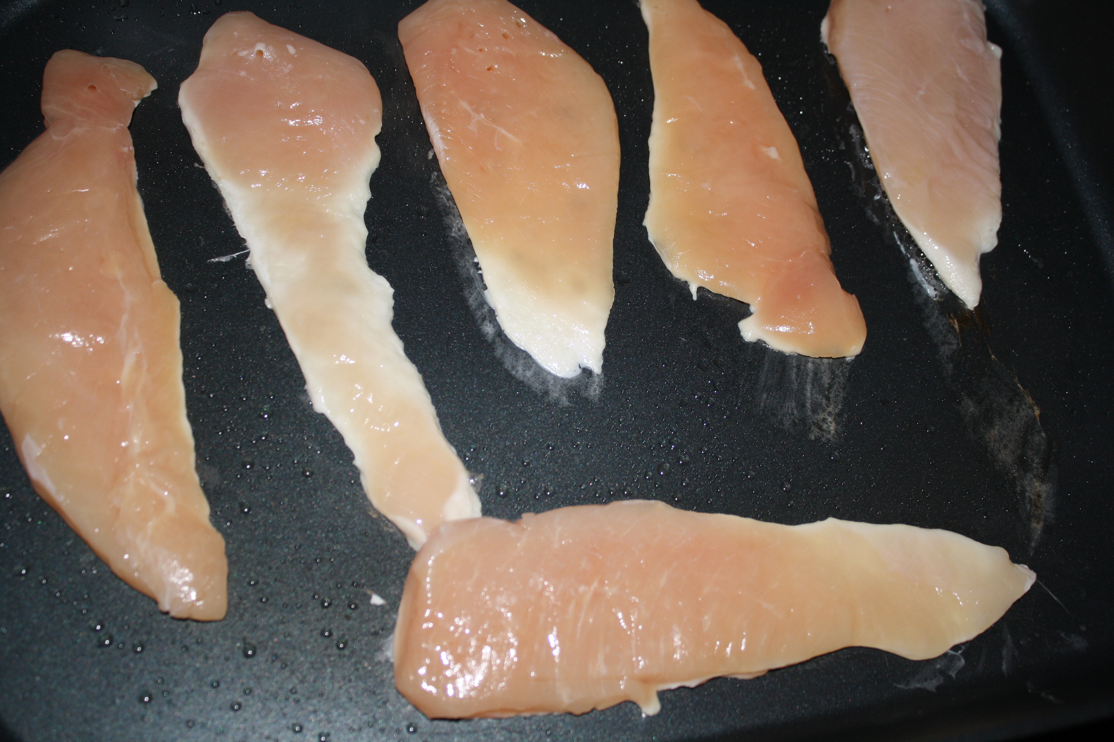 The original recipe calls for whole breast halves, but I already had some thinly sliced cutlets that were ready to use for dinner. First I fried them up in a pan on high heat, because we like it to be a little browned.