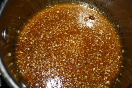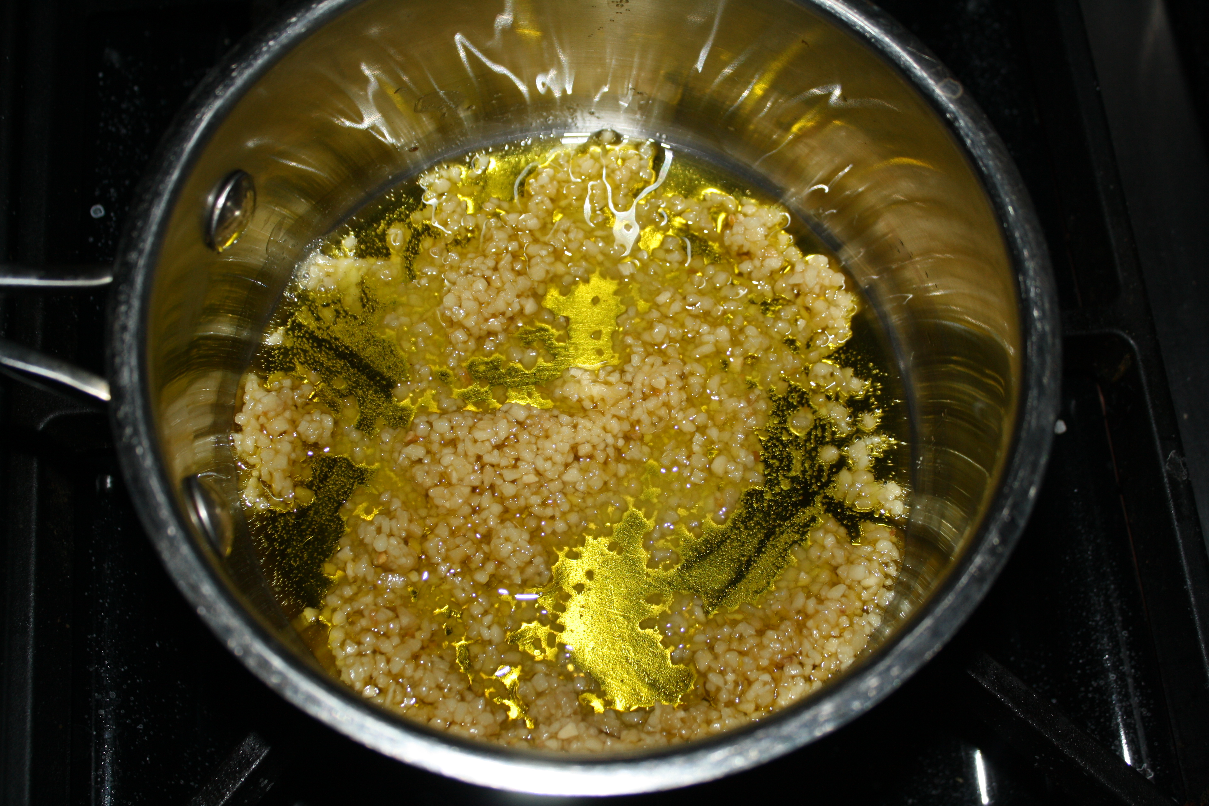 While that was cooking, I put the oil and garlic into a saute pan and heated it on medium-high until the garlic started to expand.