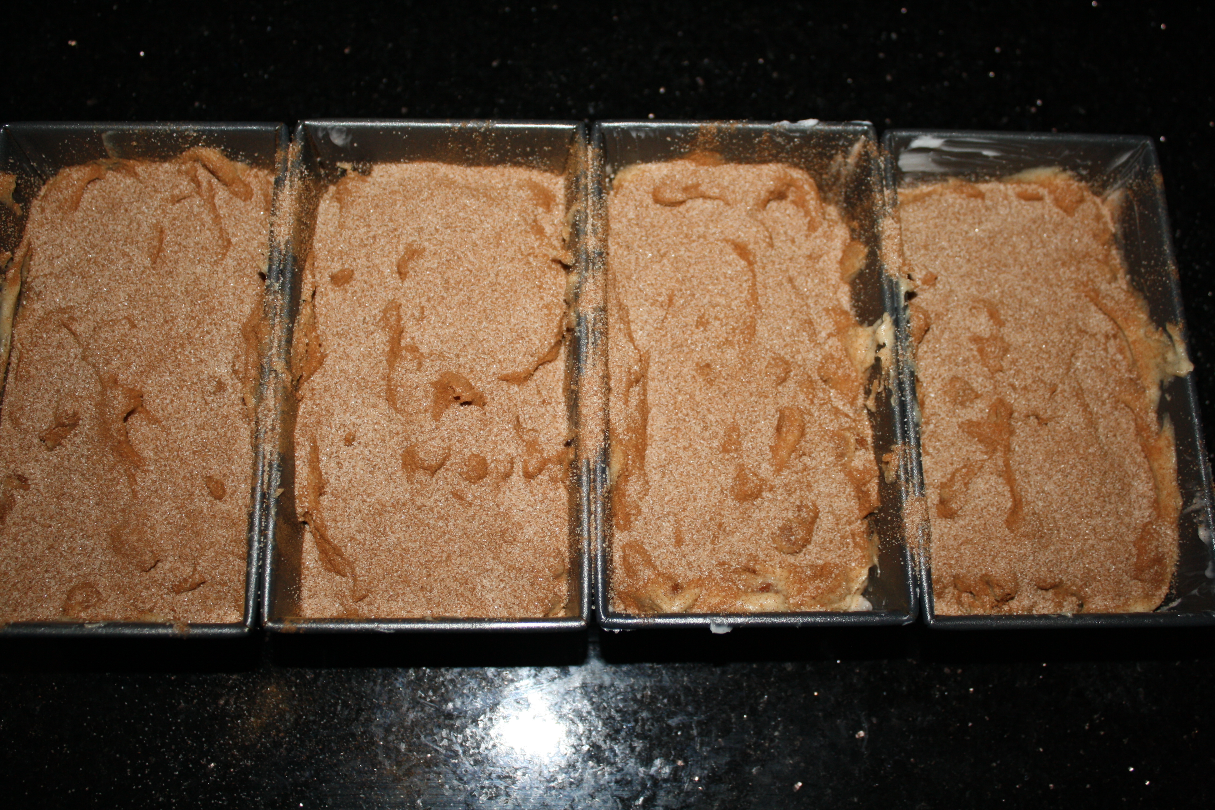 6. Mix 3 T. sugar and 3 t. cinnamon in a bowl and sprinkle over the batter in each loaf pan.