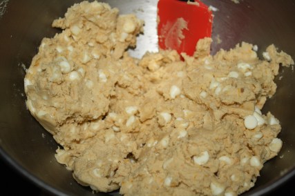 Next, I stirred in the white chocolate chips gradually to get them evenly presented.