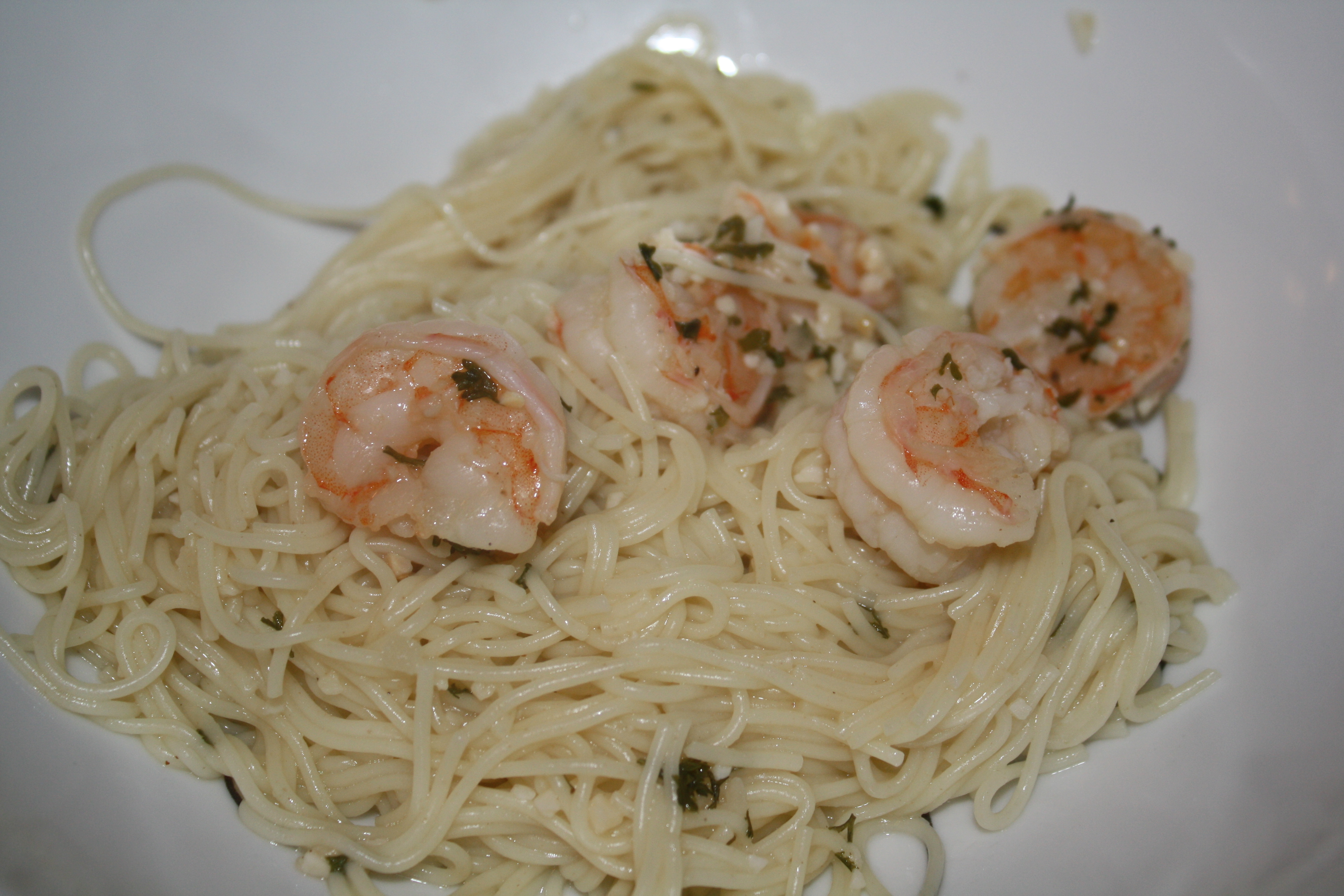 And then the shrimp and sauce were poured over the angel hair when it was done. Served with a bit of Parmesan cheese over top, the dish was delicious!