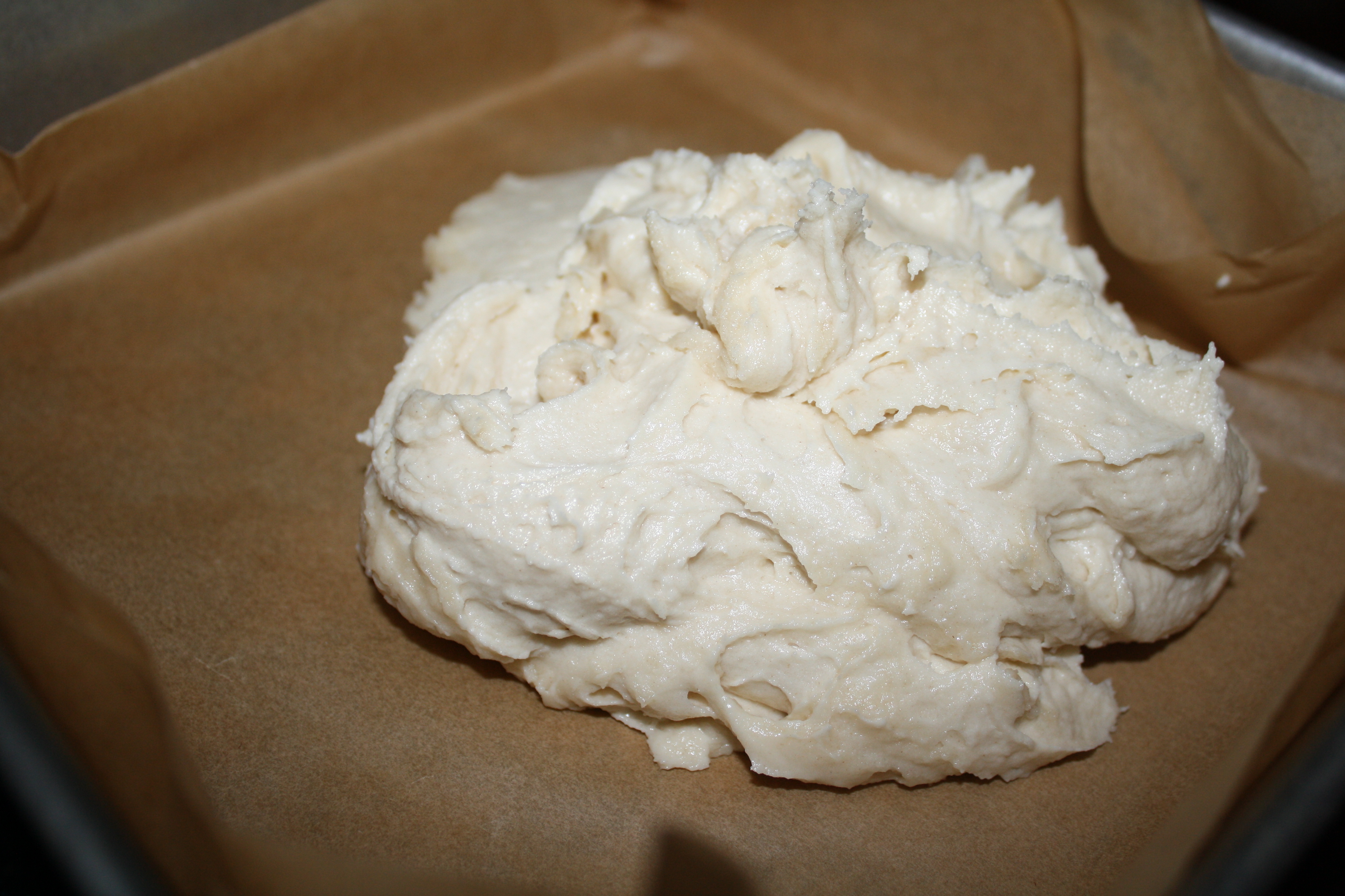 The cake dough was very thick. It went onto the pan, and I spread it evenly with a rubber spatula.