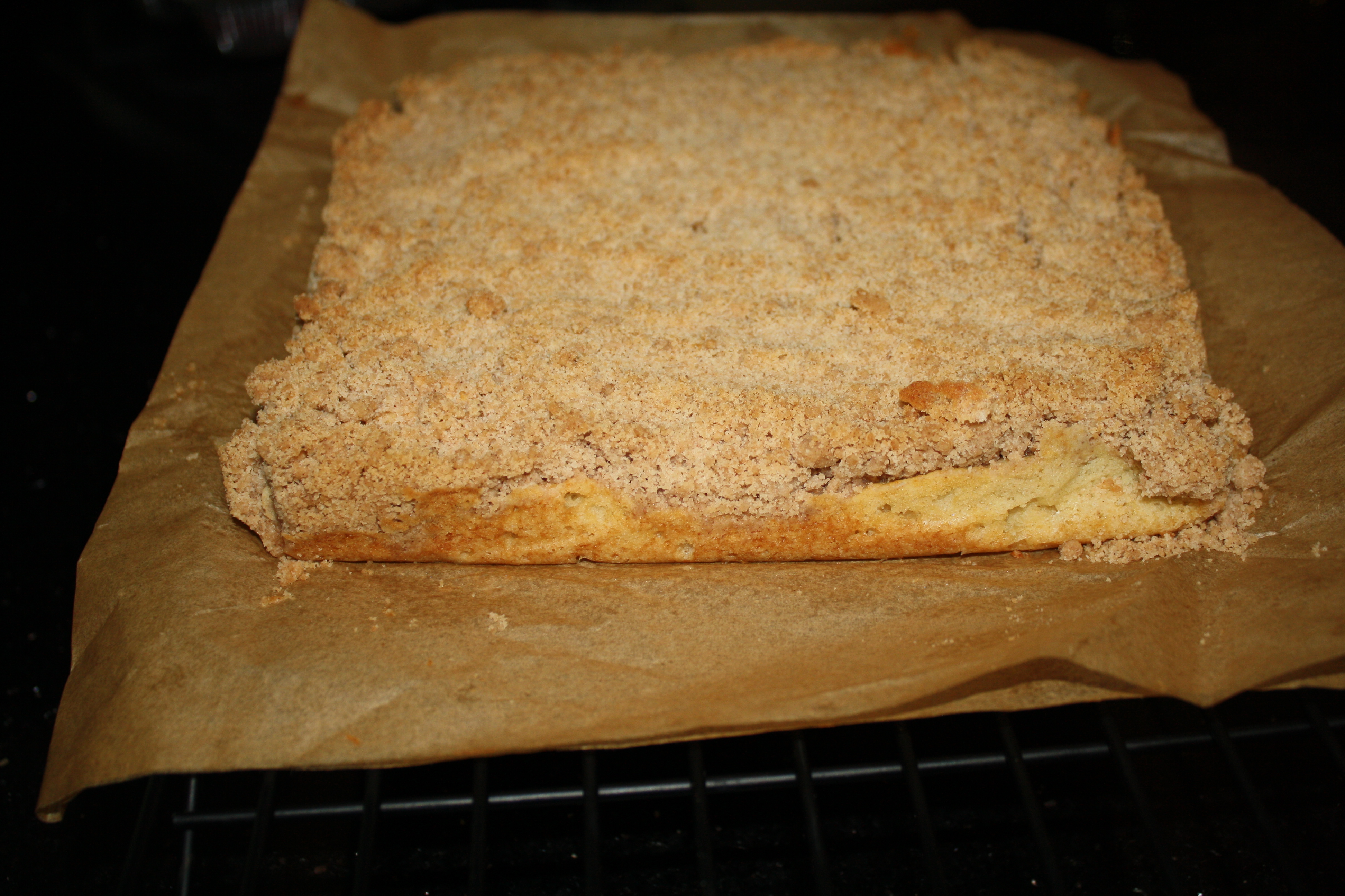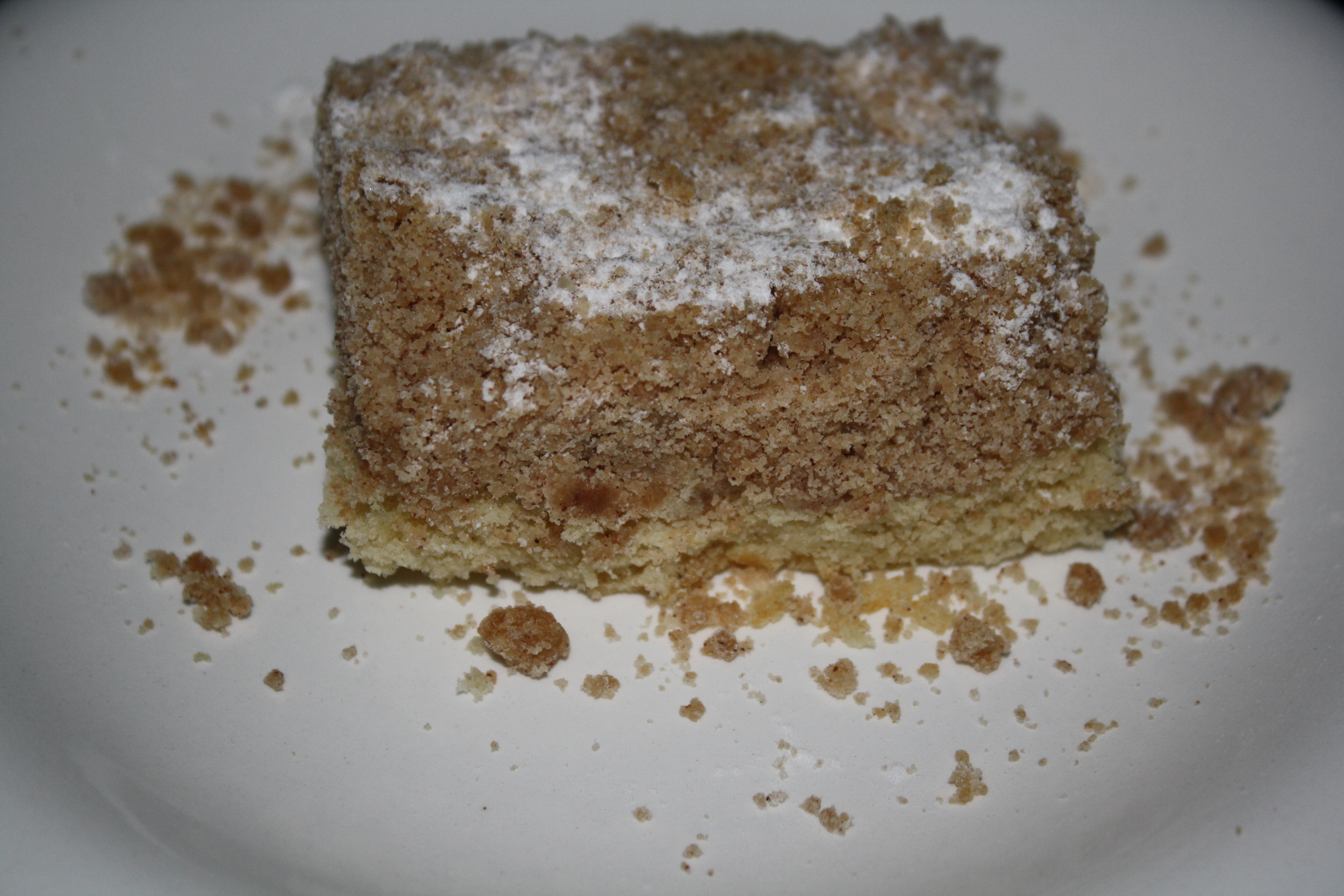Overall, the cake was good. Not dry or tough at all. My only issue was that the crumb topping was as thick as the cake itself. Perhaps if I had used the cake flour, I would have gotten a more substantial cake layer, but, it was still good. One other thing that might have made it better: Before the cake goes into the oven, take a knife and push some of the topping down into the batter. I think that would have combined the cake and cinnamon flavors a bit better…but then, would it no longer be New York Style?