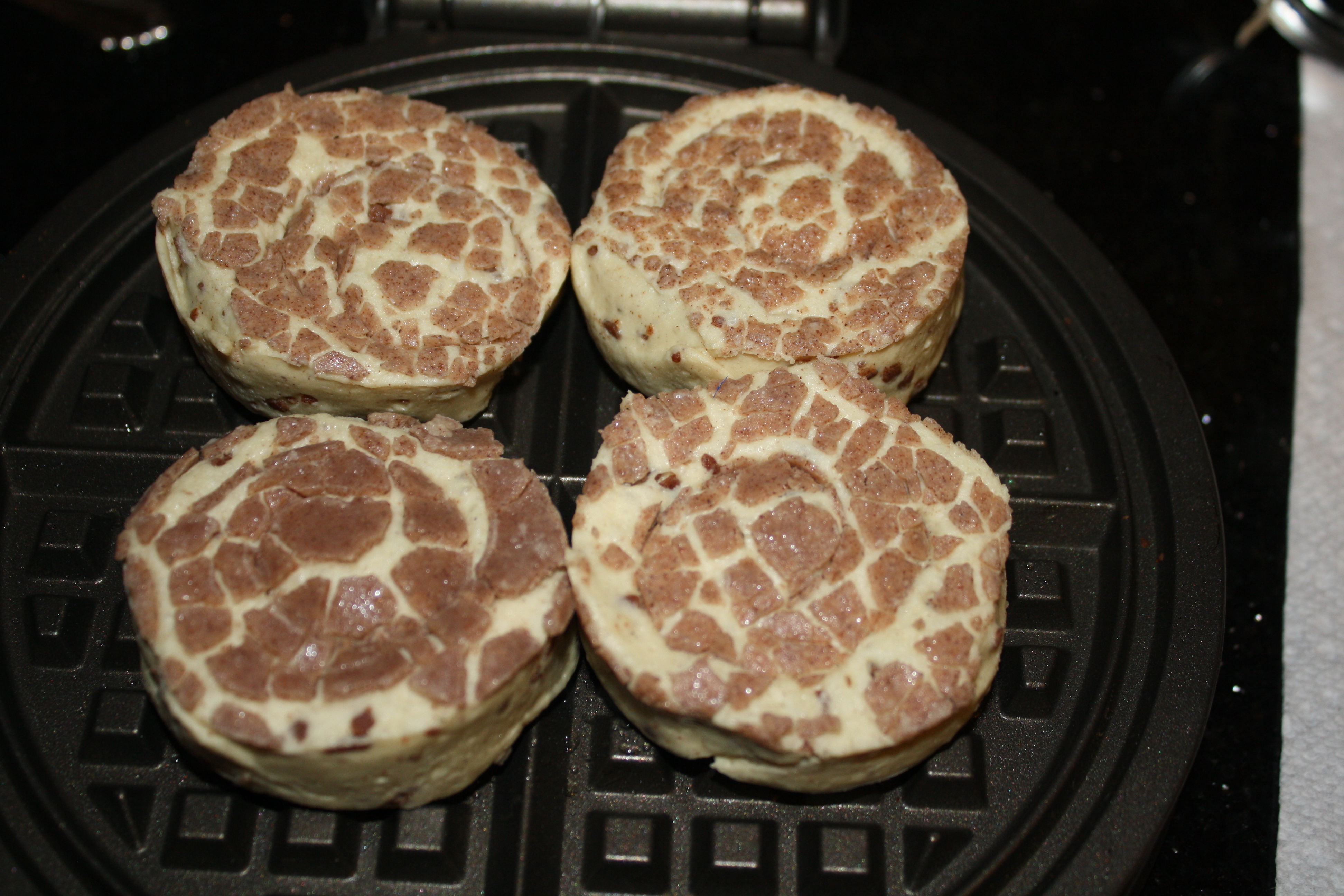 If you don’t spray the pan you will end up cinnamon rolls stuck in your waffle iron. Not fun to clean up!