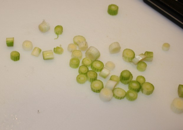 While that was cooking, I chopped up a few green onions. The original recipe didn’t call for onions, but I thought it might give the dish a little zing, plus the rice Manfrengensen had eaten at the restaurant had them.