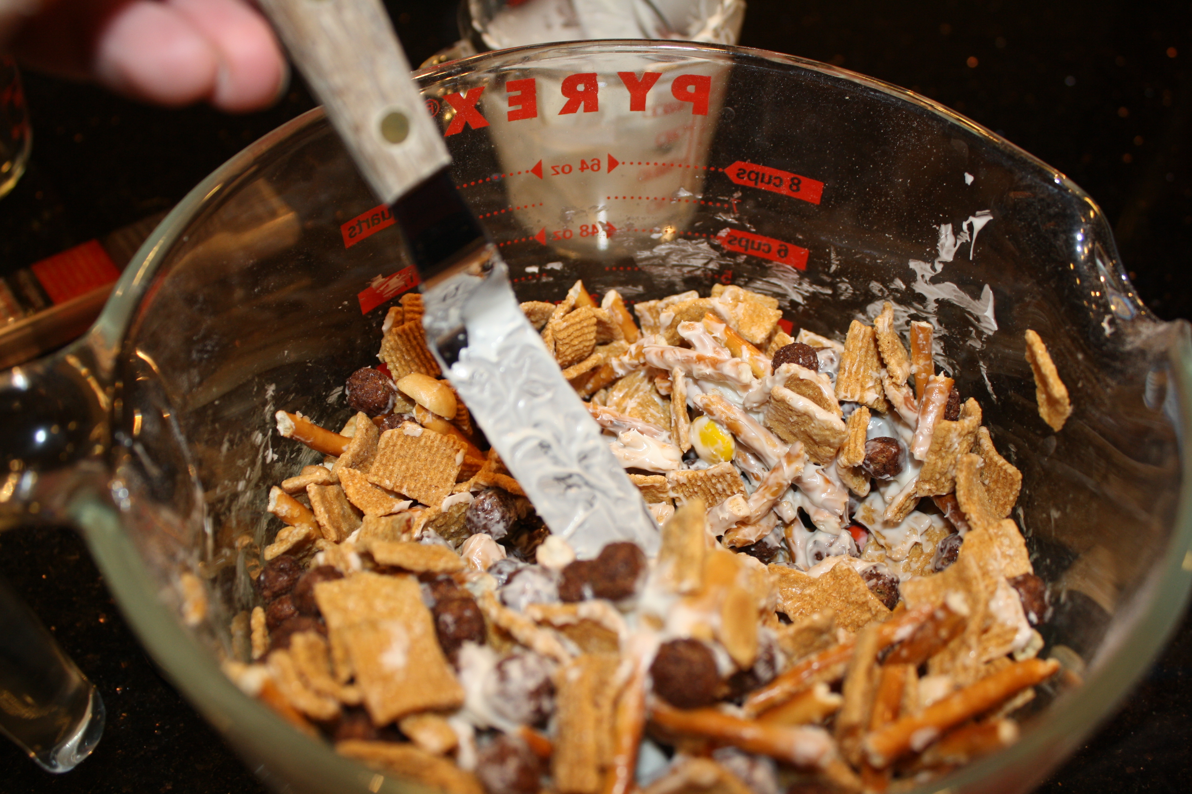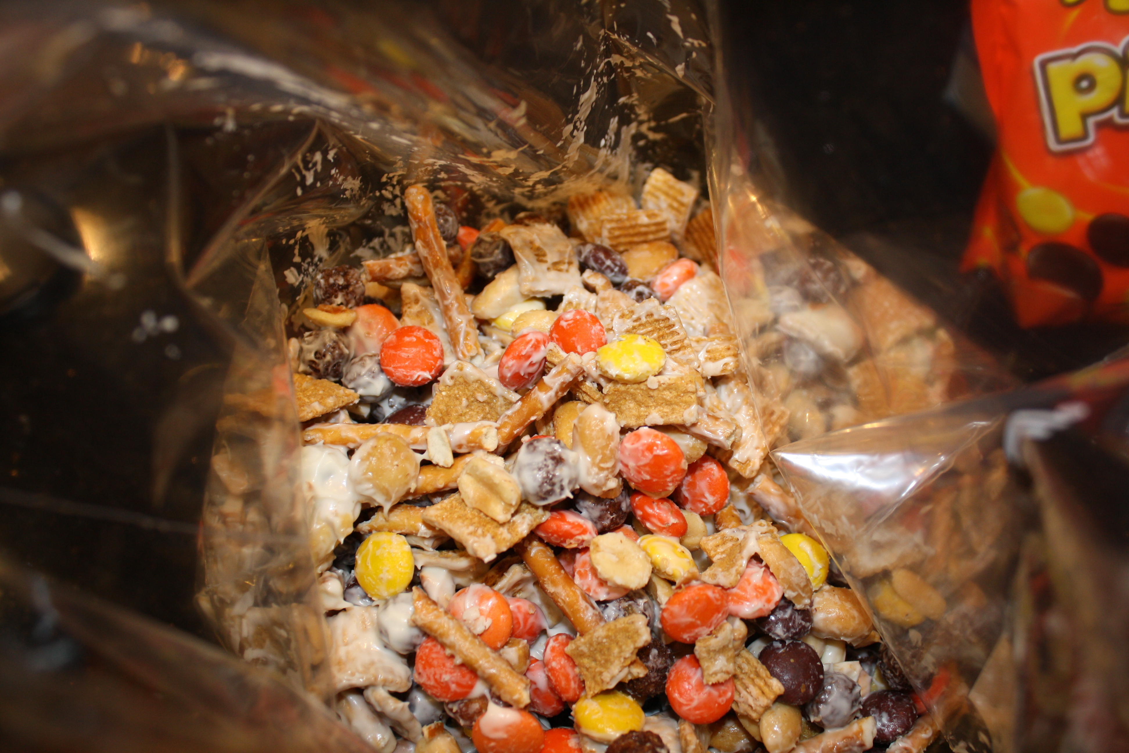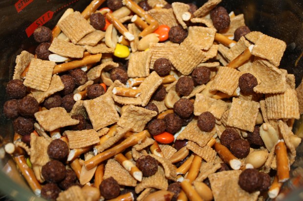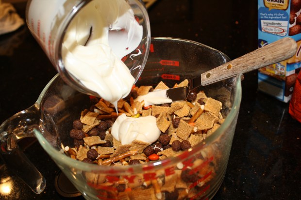 Then, in a large bowl, I put the cereals, pretzels, peanuts and Reese’s Pieces.