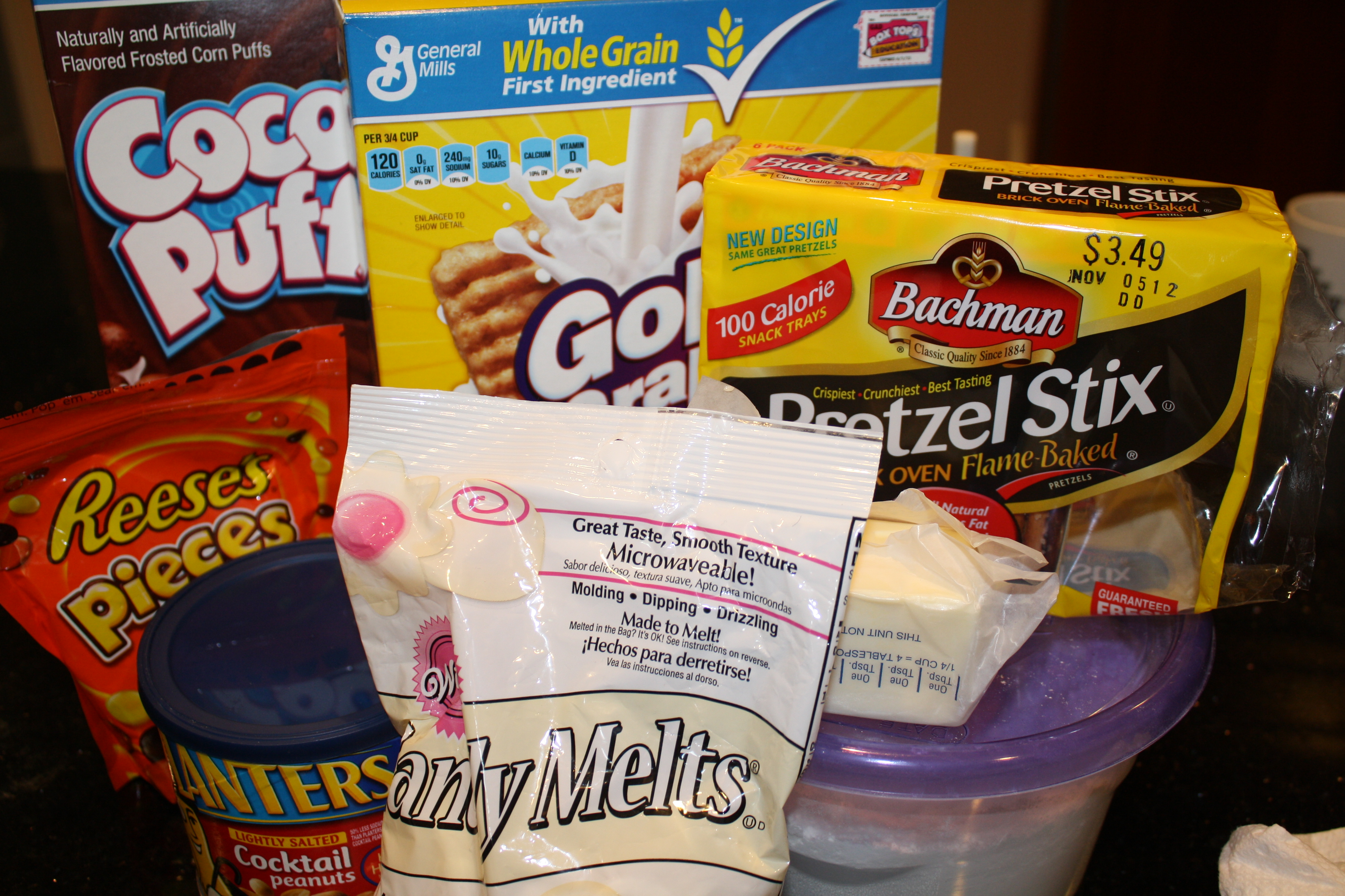 - In 1-quart microwavable bowl, microwave white chocolate and butter uncovered on High about 1 minute, stirring once, until melted and chocolate can be stirred smooth. Pour over cereal mixture, stirring until evenly coated.