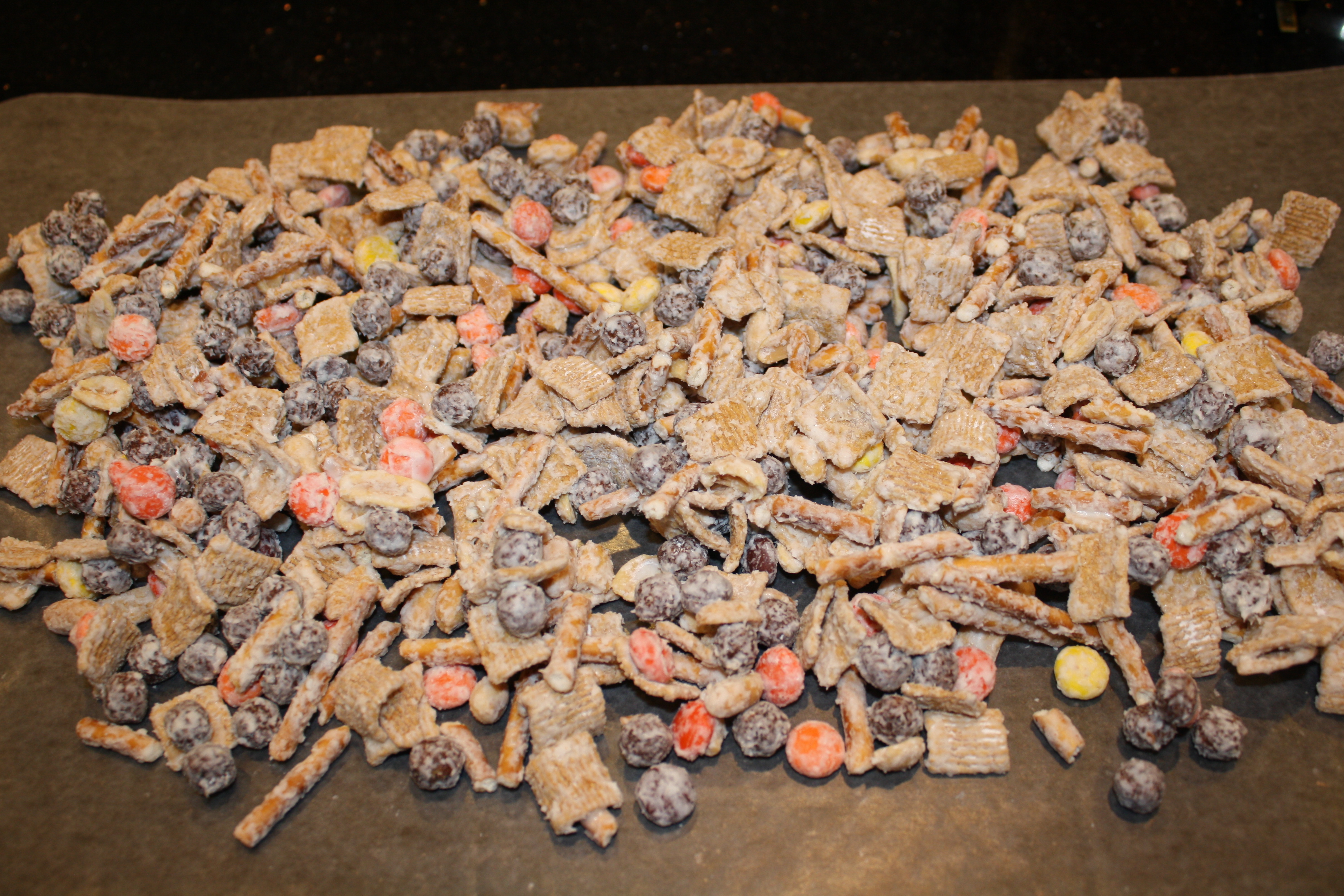 At this point I started to worry that the mix would be too sweet., but I pressed on in the name of science and dedication to the blog, removing the mix from the bag and spreading it out onto a piece of wax paper until the chocolate hardened, which didn’t take long.
