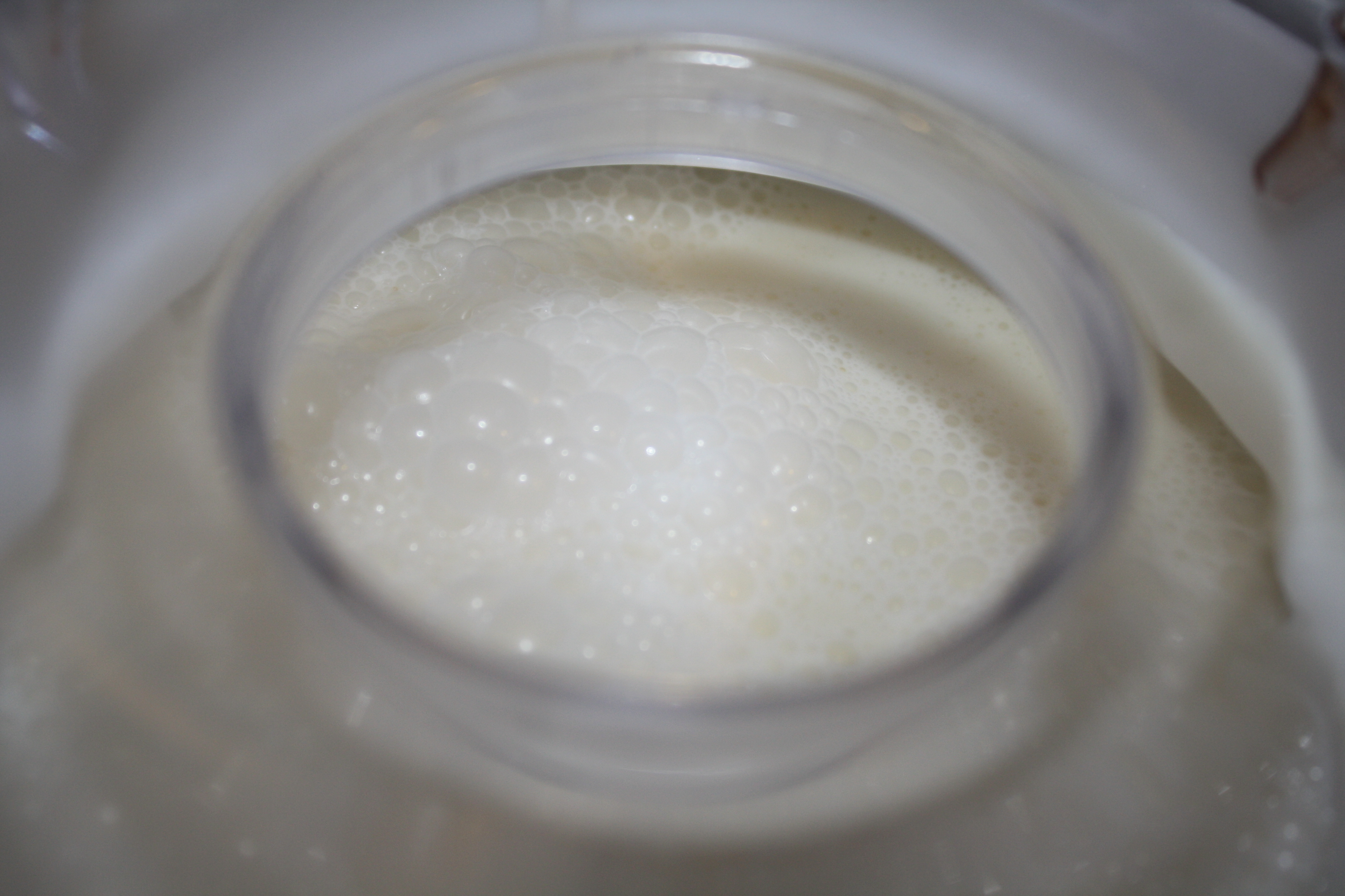 Once it had cooled, I added the cream and chilled it until it was time to go into the ice cream machine. It’s also when I realized that the recipe makes way too much ice cream. You could (and should) cut all of the amounts in half, at least if you have a smaller ice cream maker like I do, because only half of the mixture will fit into the machine. I wound up making it in two batches.
