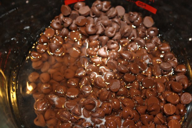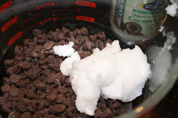 Melt chocolate chips and coconut oil in the microwave about 1 minute (depending on your microwave). Allow to sit a few minutes to allow the heat of the oil to melt the chocolate chips and then stir until smooth. It will be runny.
