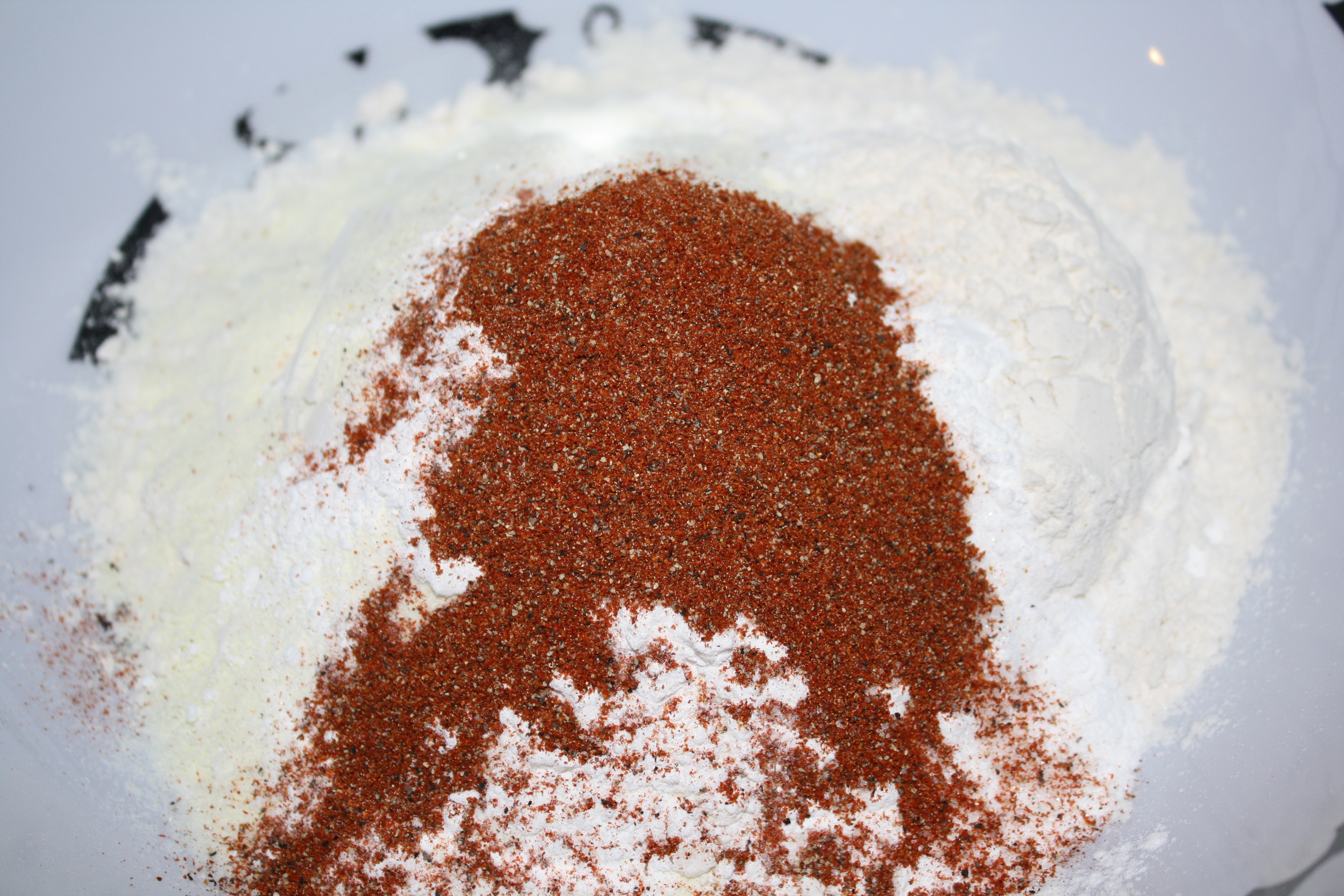 Combine flour, non-fat milk powder, baking powder, 1 tablespoon kosher salt, 2 teaspoons sugar, and 2 tablespoons of spice mixture in a large bowl and whisk until homogenous. Drizzle 3 tablespoons milk/egg mixture into flour mixture and rub with fingertips until the flour mixture is coarse like wet sand.