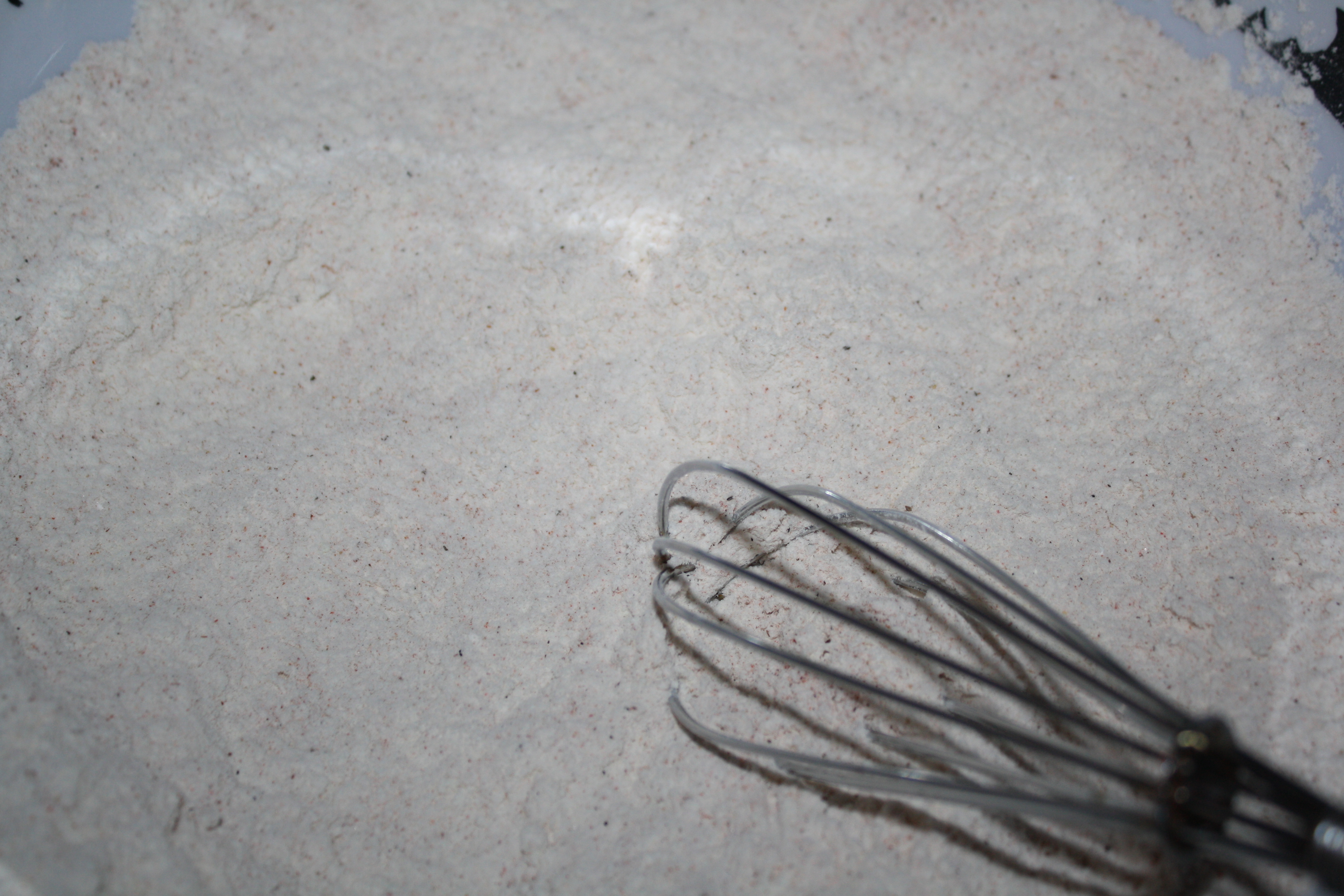 The rest of the dry ingredients were put into a large, flat bowl since we would eventually be dredging the cutlets through them. I did not add any MSG because it’s a migraine trigger for me, but if you use it, then add it here. The recipe says to add two tablespoons of the pepper mixture to the dry ingredients, but there were barely more than two tablespoons all together, so I had to make more for later.