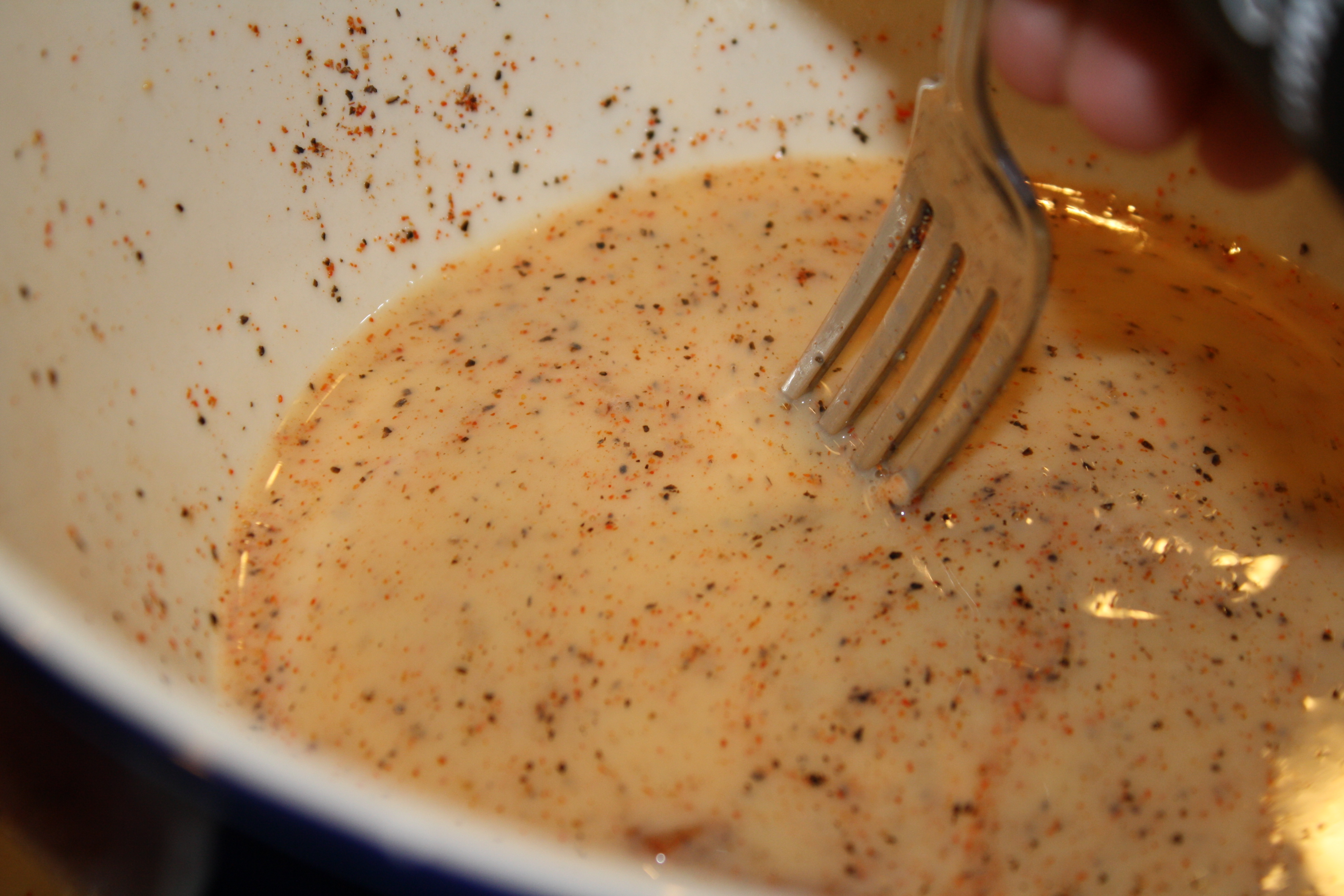 Then mixed the eggs and milk in a large bowl.