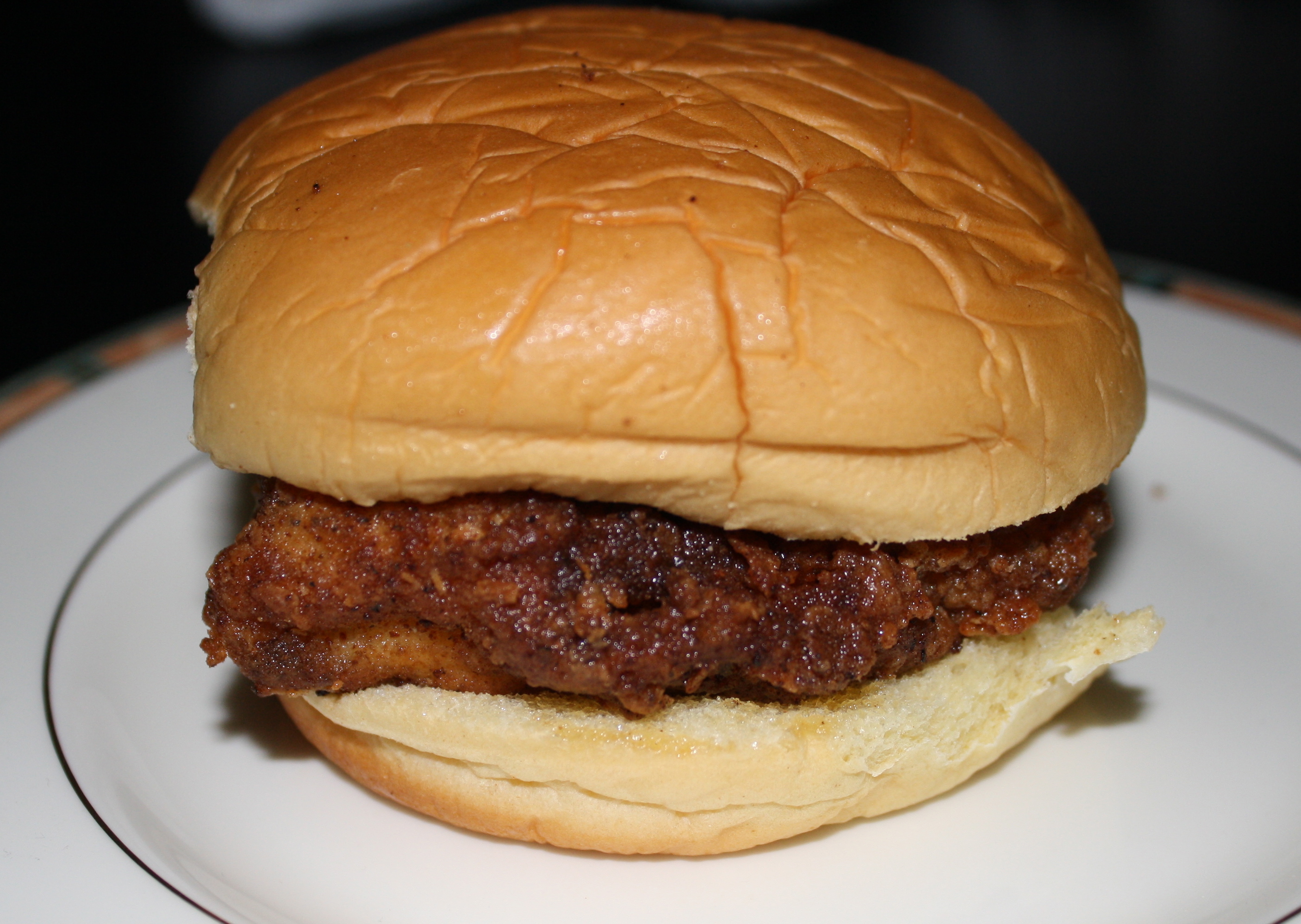 And then we put the sammies together and enjoyed. (Steamed buns optional.) It was pretty close to the real thing. In fact, in the future, if I ever make the Chik-Fil-A nuggets again, I think I am going to use this breading technique to make them. Adding powdered milk and a little bit of the milk mixture to the breading made it much more crisp, and gave it those nice crispy sort-of nubs in the coating.