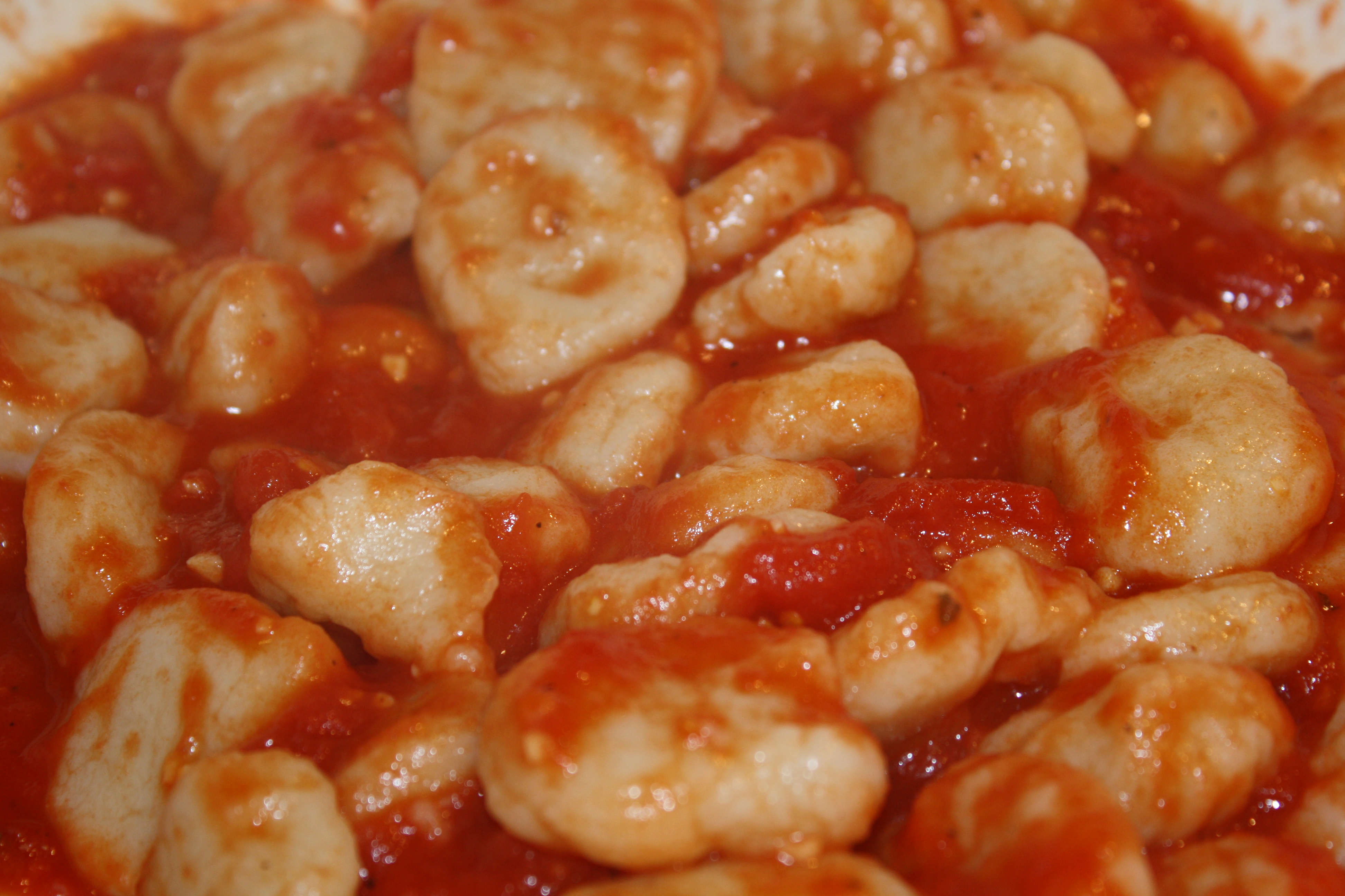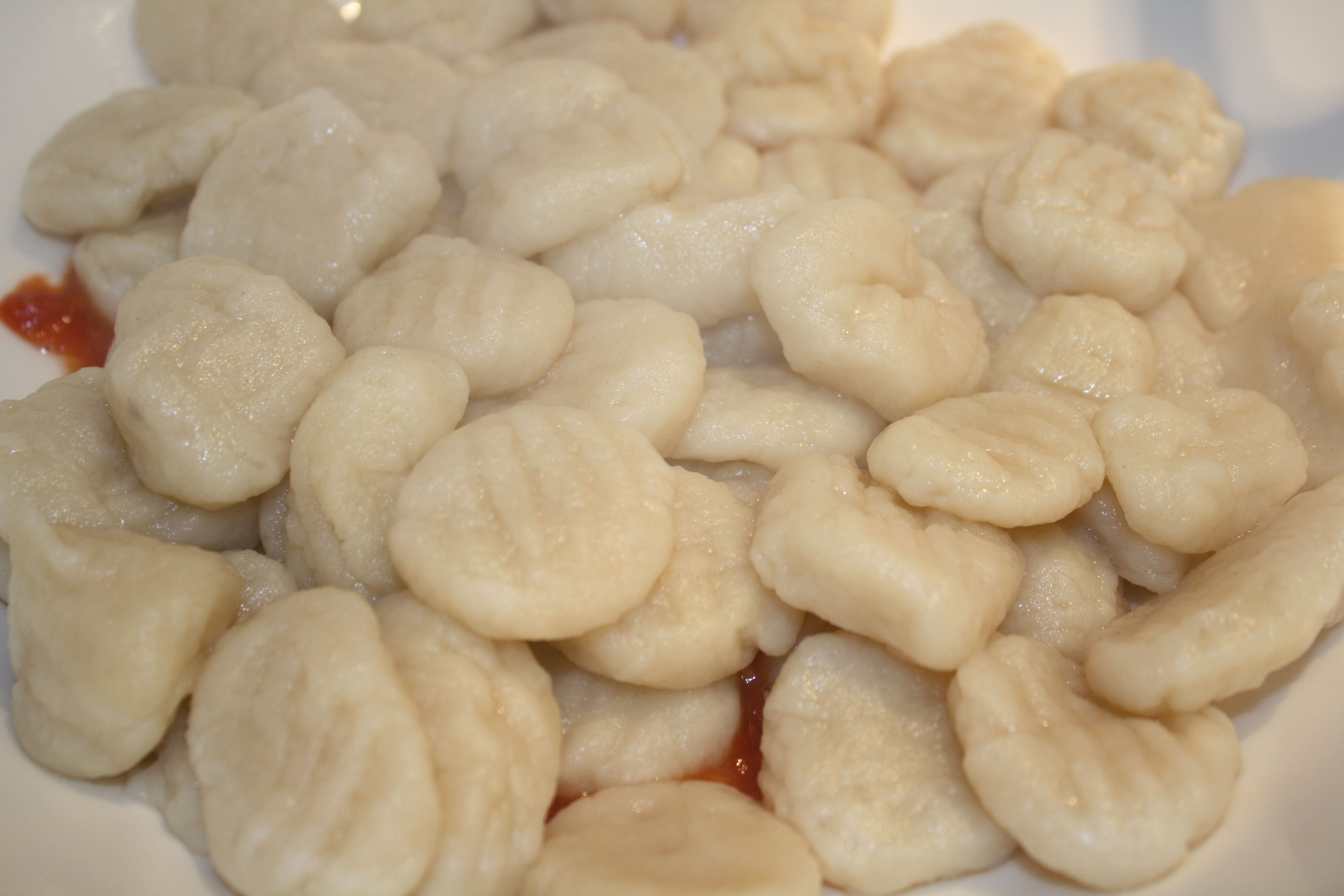 Gnocchi originated in Italy, though the Romans most likely copied the idea from dishes they discovered in the Middle East. Nocchio in Italian translates to a “knot in wood” (get it? Pinocchio?) or the dish may also get its name from the word for knuckle, which is nocca. (All of that is from Wikipedia, btw, I don’t want you thinking I’m like the Cliff Clavin of food. That’s Alton Brown‘s job.) But that makes a lot of sense when you think about it because traditionally, a gnocchi is roundish and is scored with a few little lines. (Look down at your knuckle to see what I mean.)