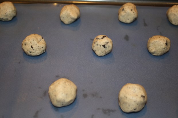 Then I used a teaspoon to pull out smallish chunks that were rolled into balls and placed on a cookie sheet lined with a silicone mat, which I find really keeps the cookies from burning on the bottom.