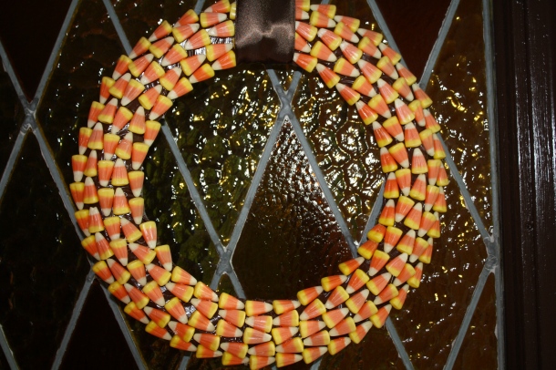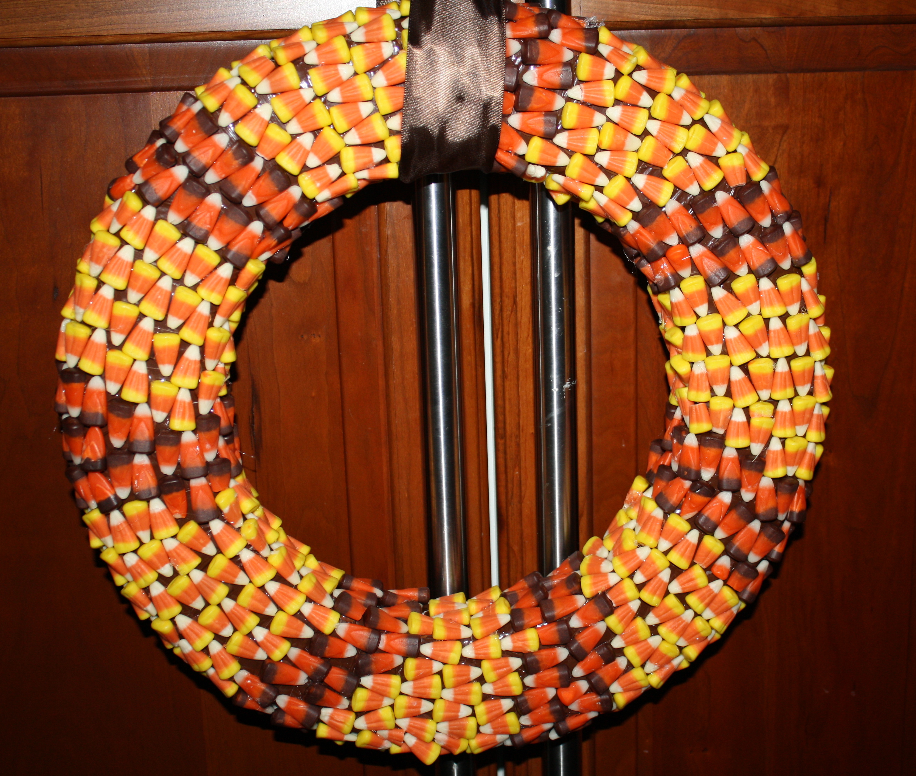 And then, for a little variation, I mixed the plain candy corn with the indian corn, tied a ribbon on it, and it’s good to go. This was a bigger wreath, so it used more corn, plus I also corned the inside and outside of the frame as well. Personally, I’m more happy with this pattern than the original. Now all I need to do is wait for the temperature to really drop, and I can hang it on the door. One more week should do the trick, I think.