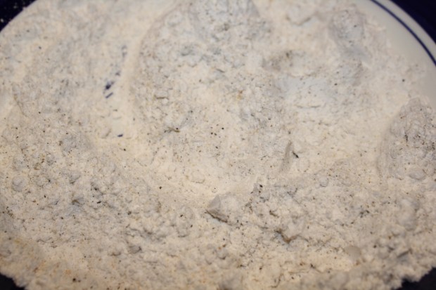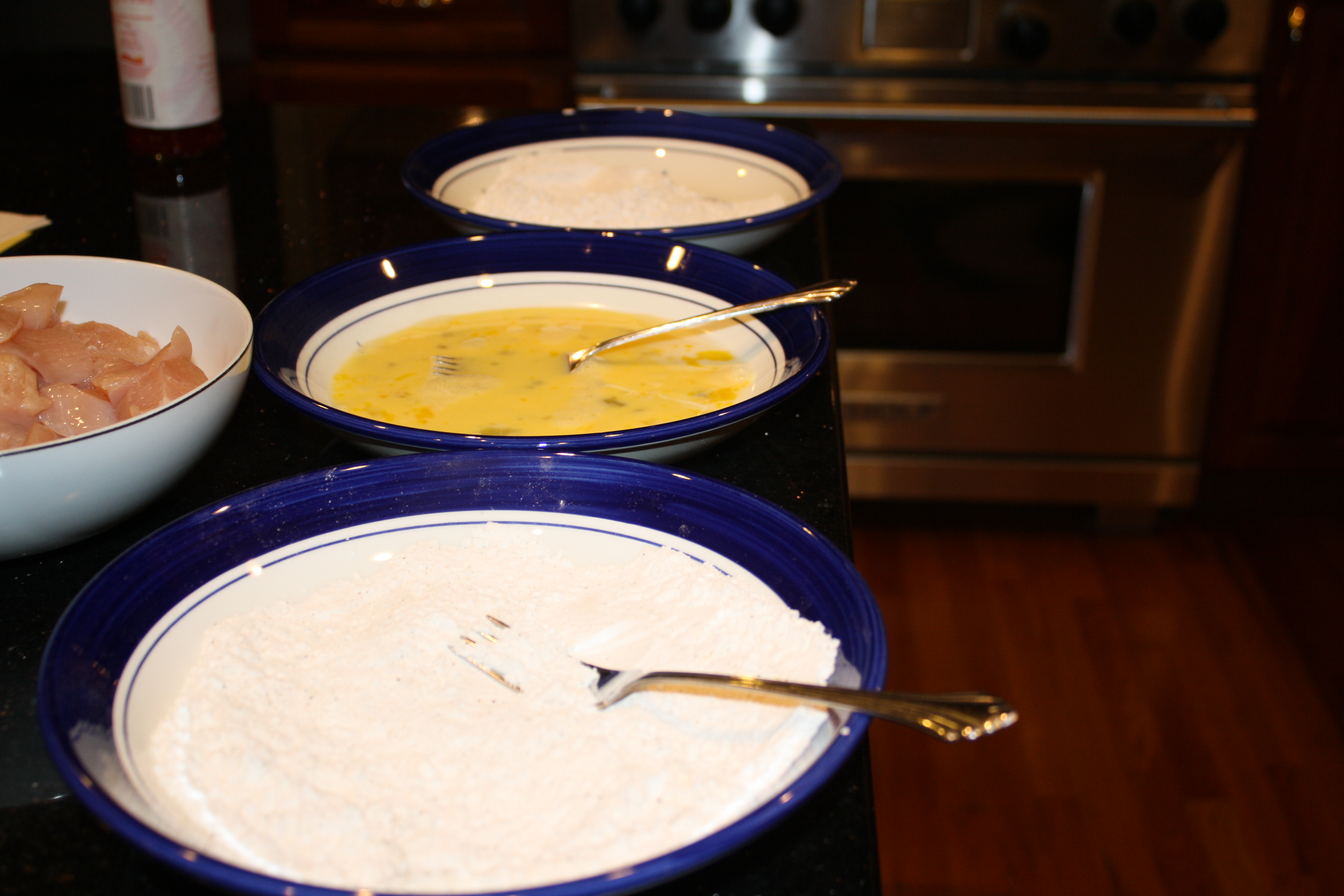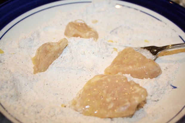 and then prepared the egg, splitting the flour in half so that I could dredge the chicken through it twice.
