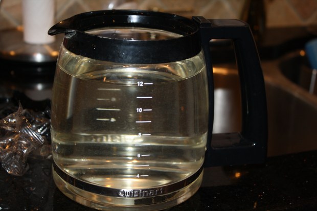 There are lots of tips on how to clean a coffee maker on Pinterest. I found one on Wikihow that seemed to have some good tips, so I went with their advice. Most manufacturers and advisers tell you to mix one part vinegar with two parts water and run that through the machine, but I had a feeling that my situation was beyond that. So, using Wikihow’s advice, I made a mixture that was half white vinegar,