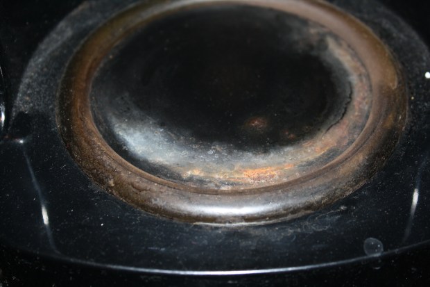 I repeated the scrubbing with the paste about ten times. It was better, but the warming plate still wasn’t like new,
