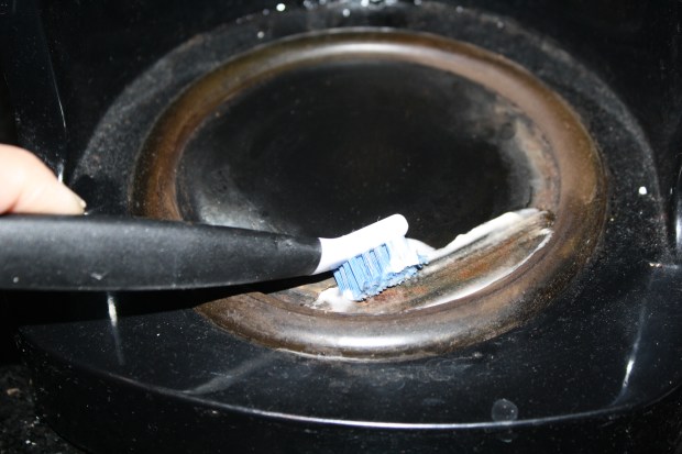 All that burned-on coffee couldn’t be doing anyone any favors. Plus, it was probably contributing to the snap, crackle and pop sounds that came out of the thing every time it was in use. So I made a paste of baking soda and water (another Pinterest tip for all things that need cleaning).