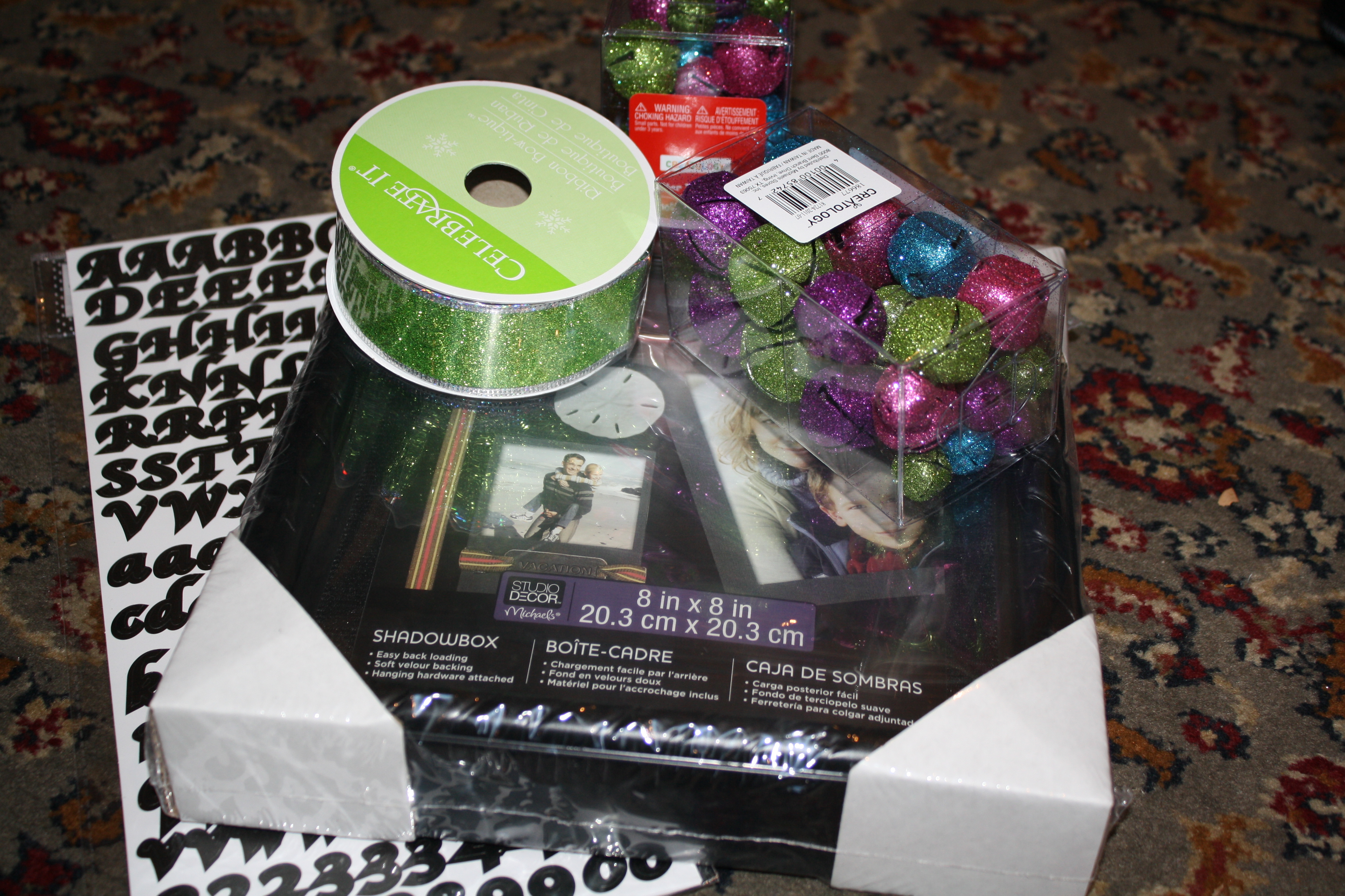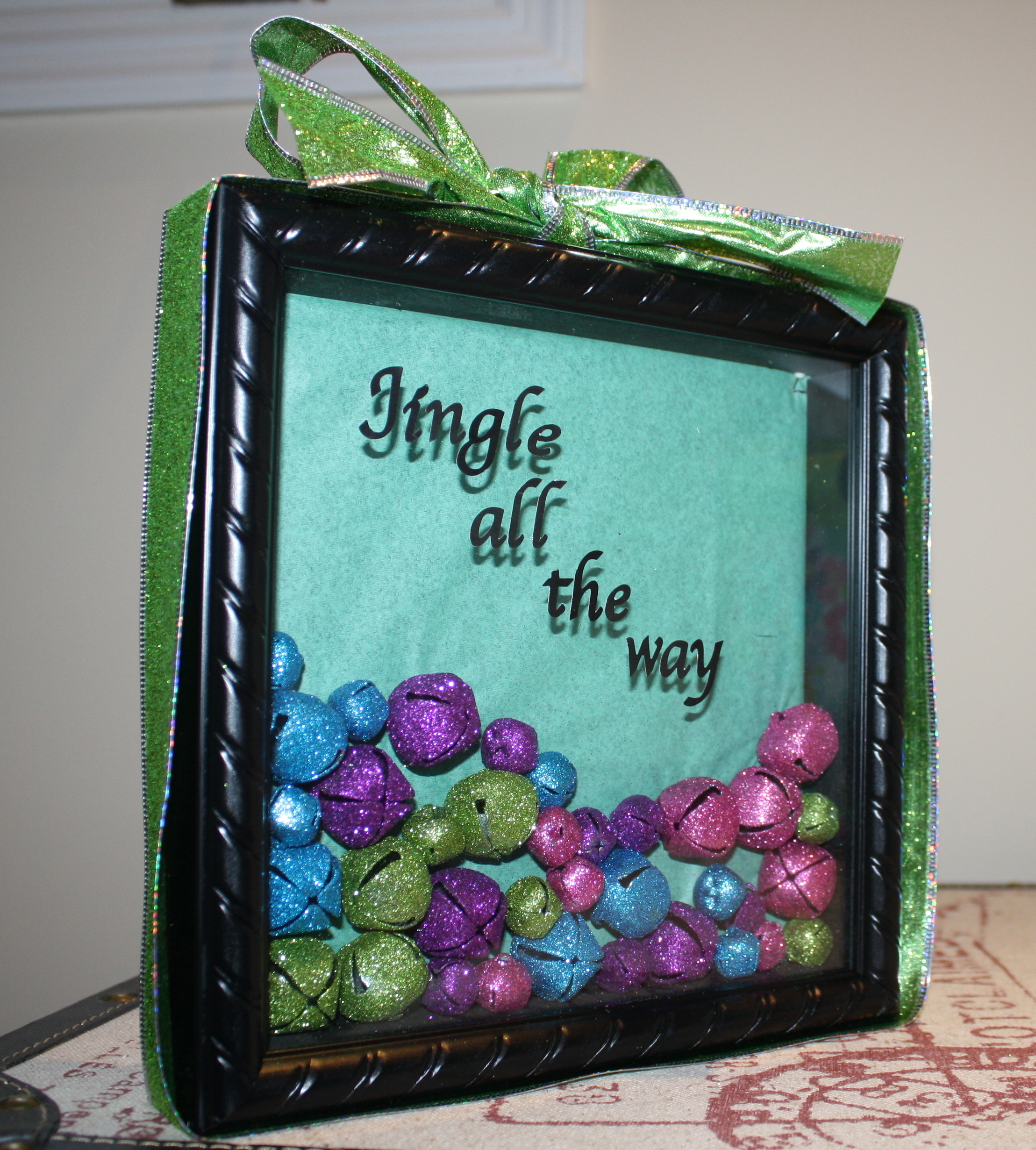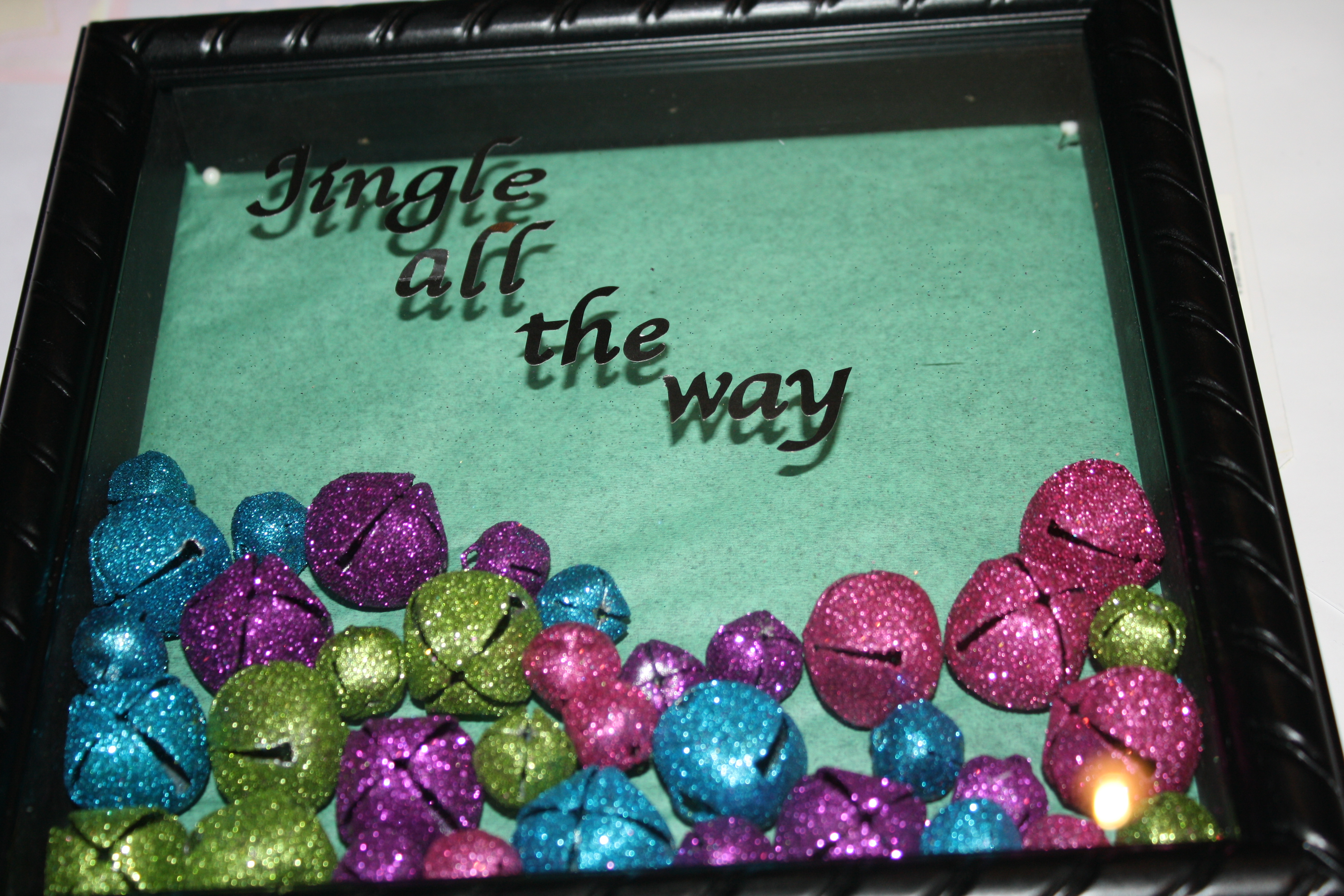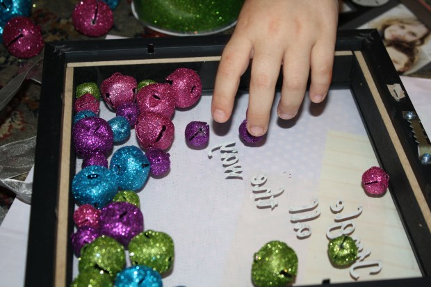And then The Princess arranged our jingle bells in the box. You can use any color or size bells that will fit in your shadow box. We went with colored glitter ones because that’s how The Princess likes to roll.
