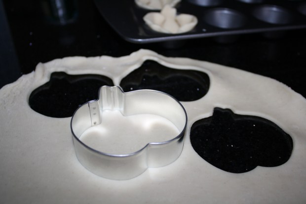These were very easy to make and they looked really great in the end. First I rolled out the pie crust and cut pumpkins out with a cookie cutter. You can do this with any shape though. I have seen ones on the boards that were done with flower-shaped cutters that looked really cute too. Once you cut the dough, you will need to roll it a little flatter to fit it into the cupcake tins.
