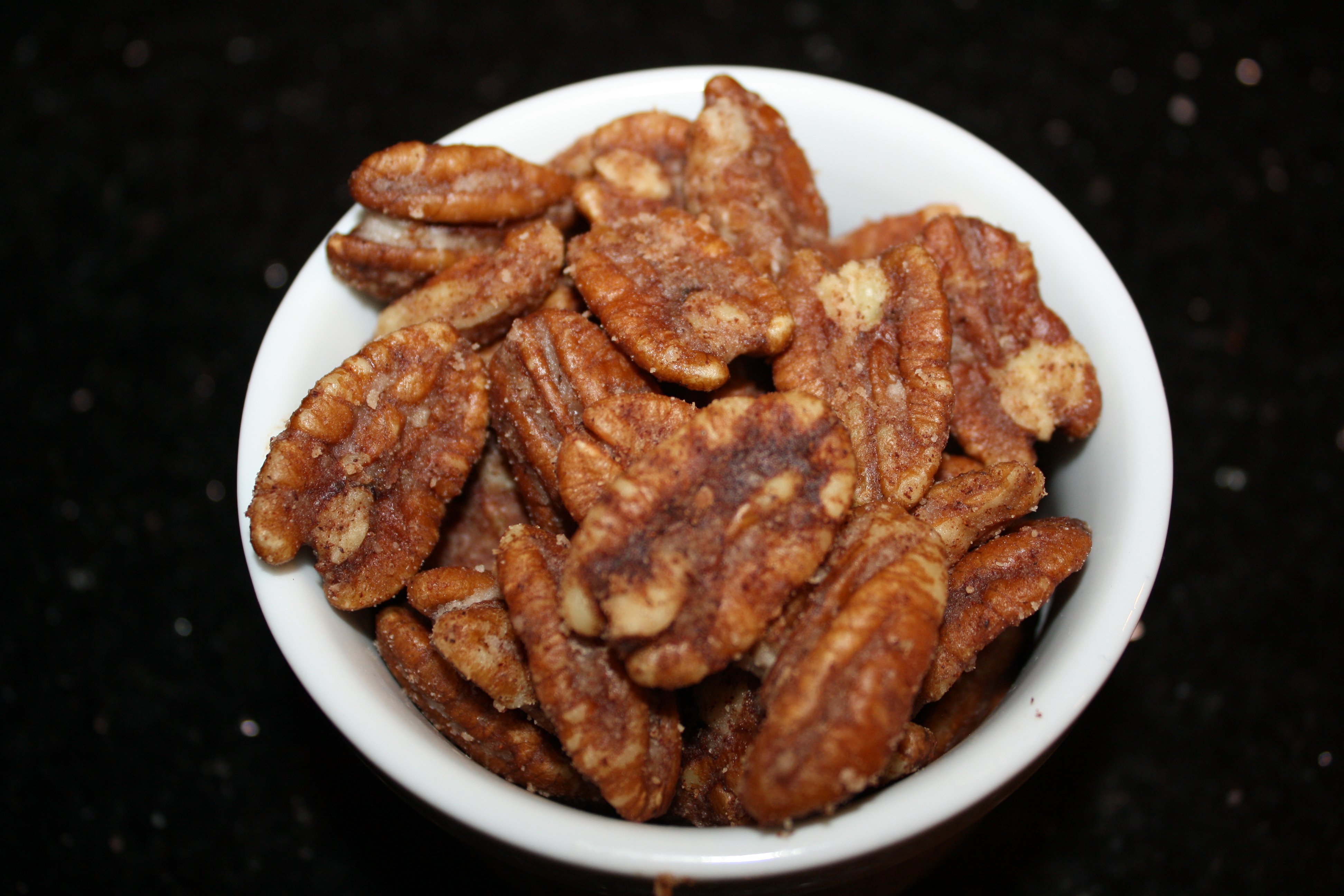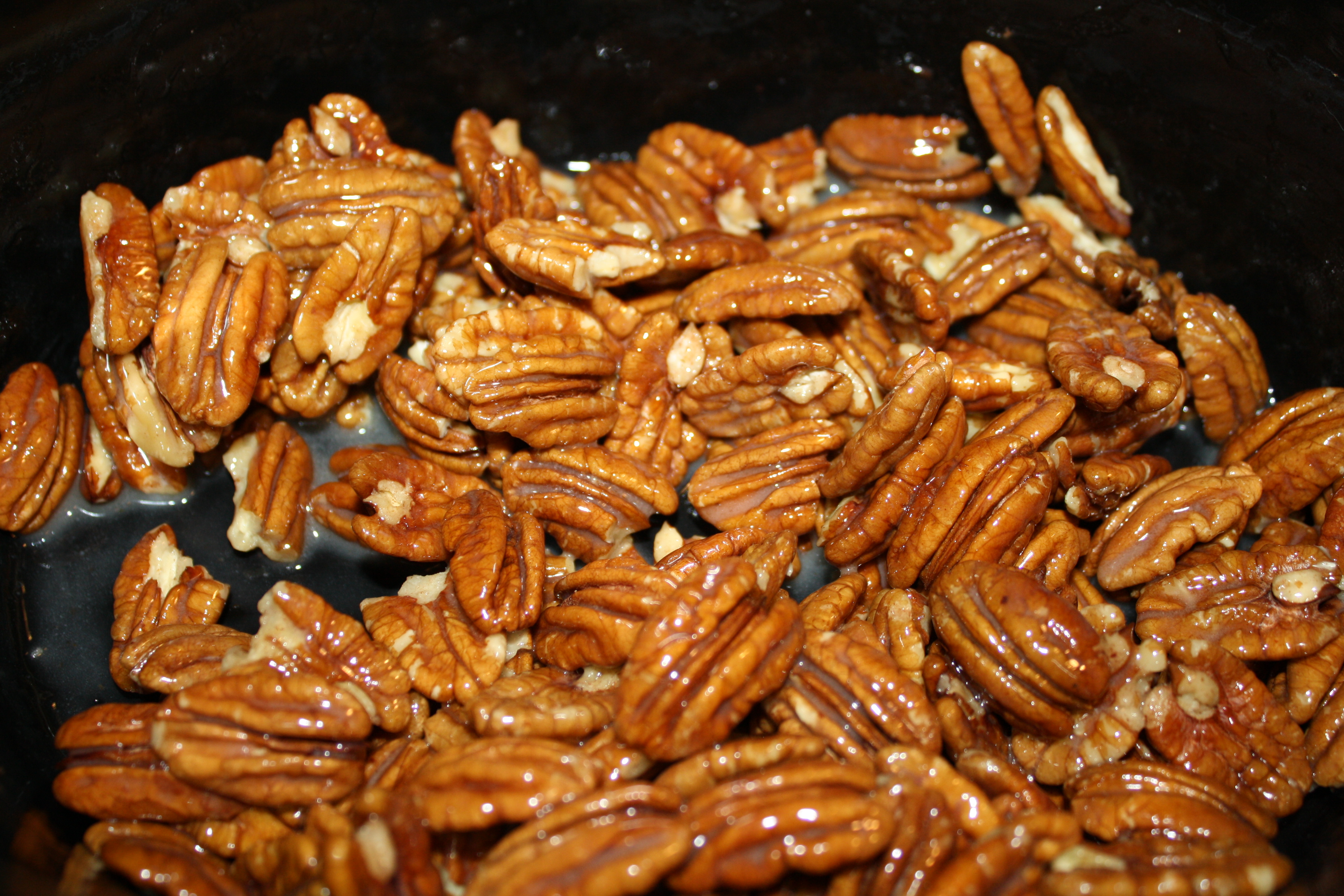 Not too long ago, I made some cinnamon almonds in the crock pot, and they weren’t bad, but they weren’t too crispy either. Recently I found another recipe on the boards for crock pot pecans that claimed the nuts turned out crunchy in the end, so I decided to give it a try. The photo on Pinterest looks like this: