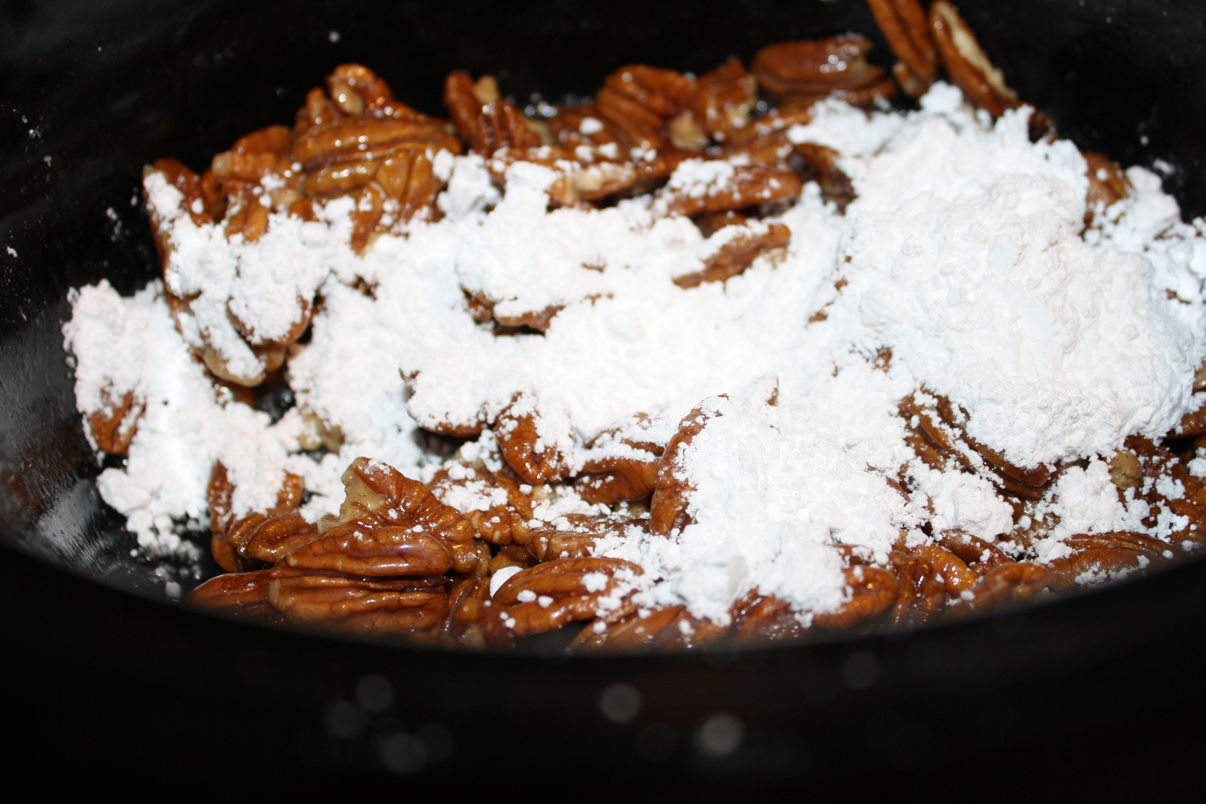 First I put the pecans into the crock pot, which had been heated on high for fifteen minutes. These were coated thoroughly with the melted butter.