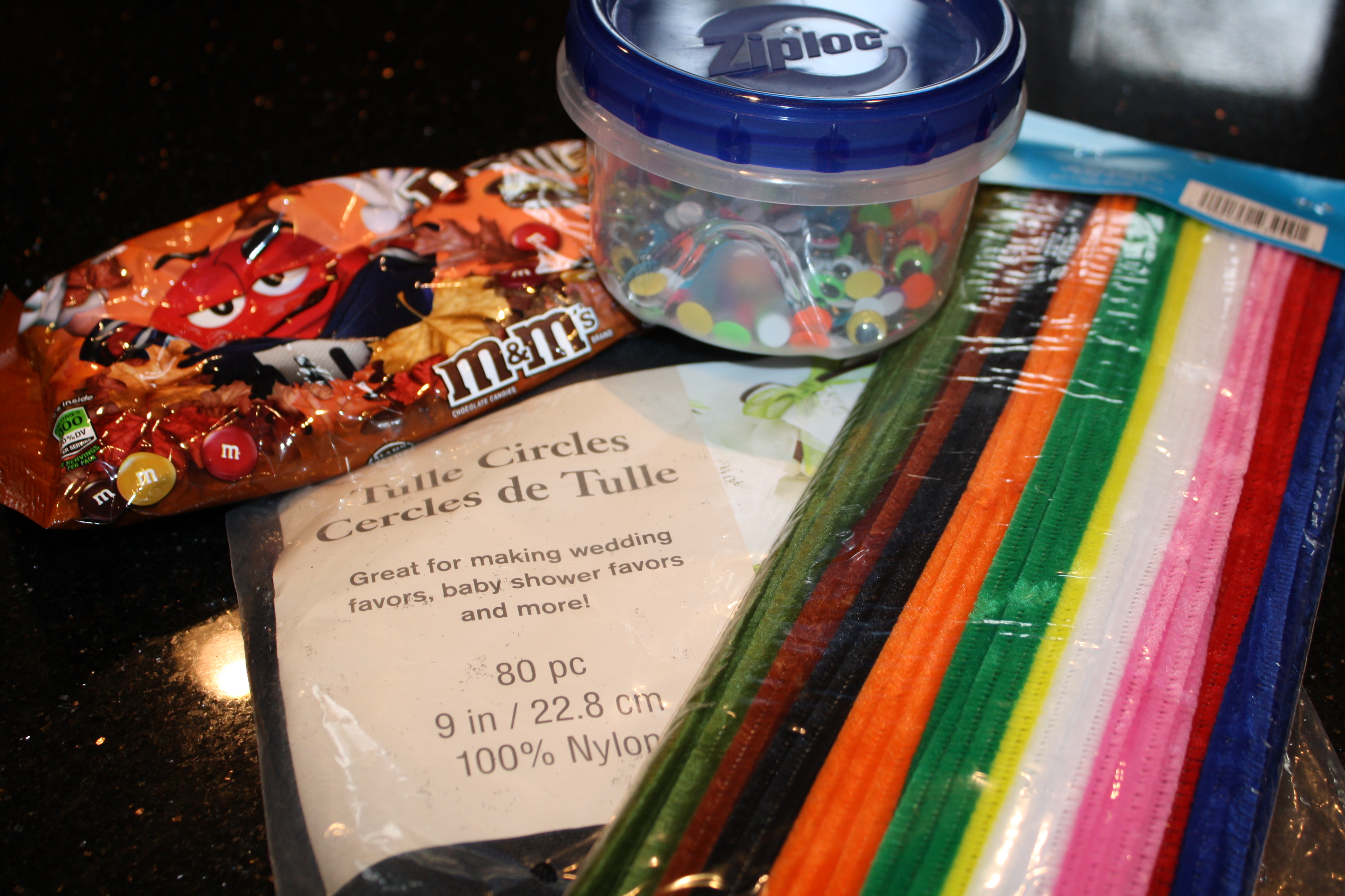 Next, I filled the tulle circles with candies and instead of using rubber bands to secure them, I twisted a small piece of black pipe cleaner.