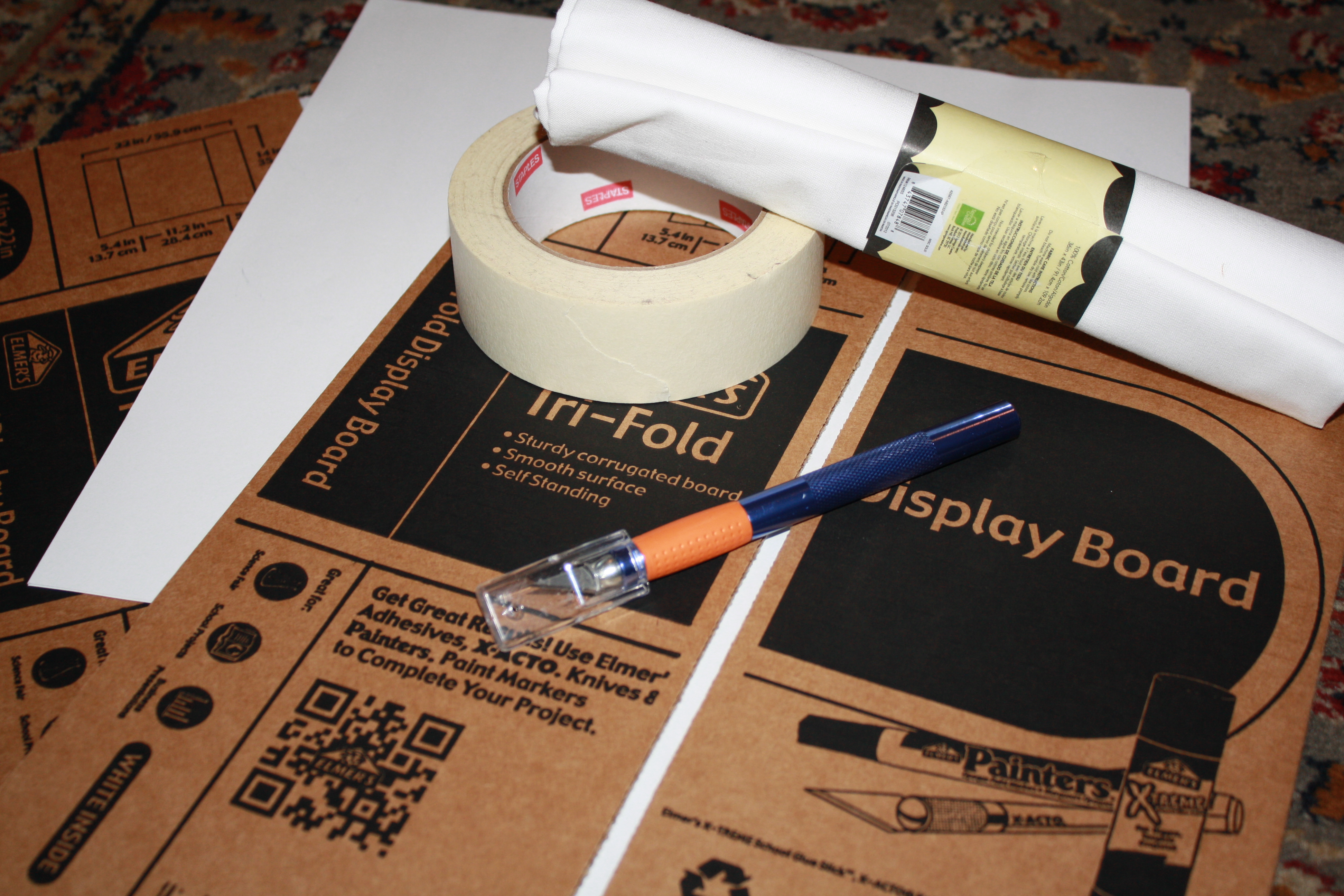 First, I took the two tri-fold display boards. The only ones I could find locally were the larger ones that you might use in a science fair project., but I did find 14×22″ ones online. These were measured and cut two inches from each side to make the frame.