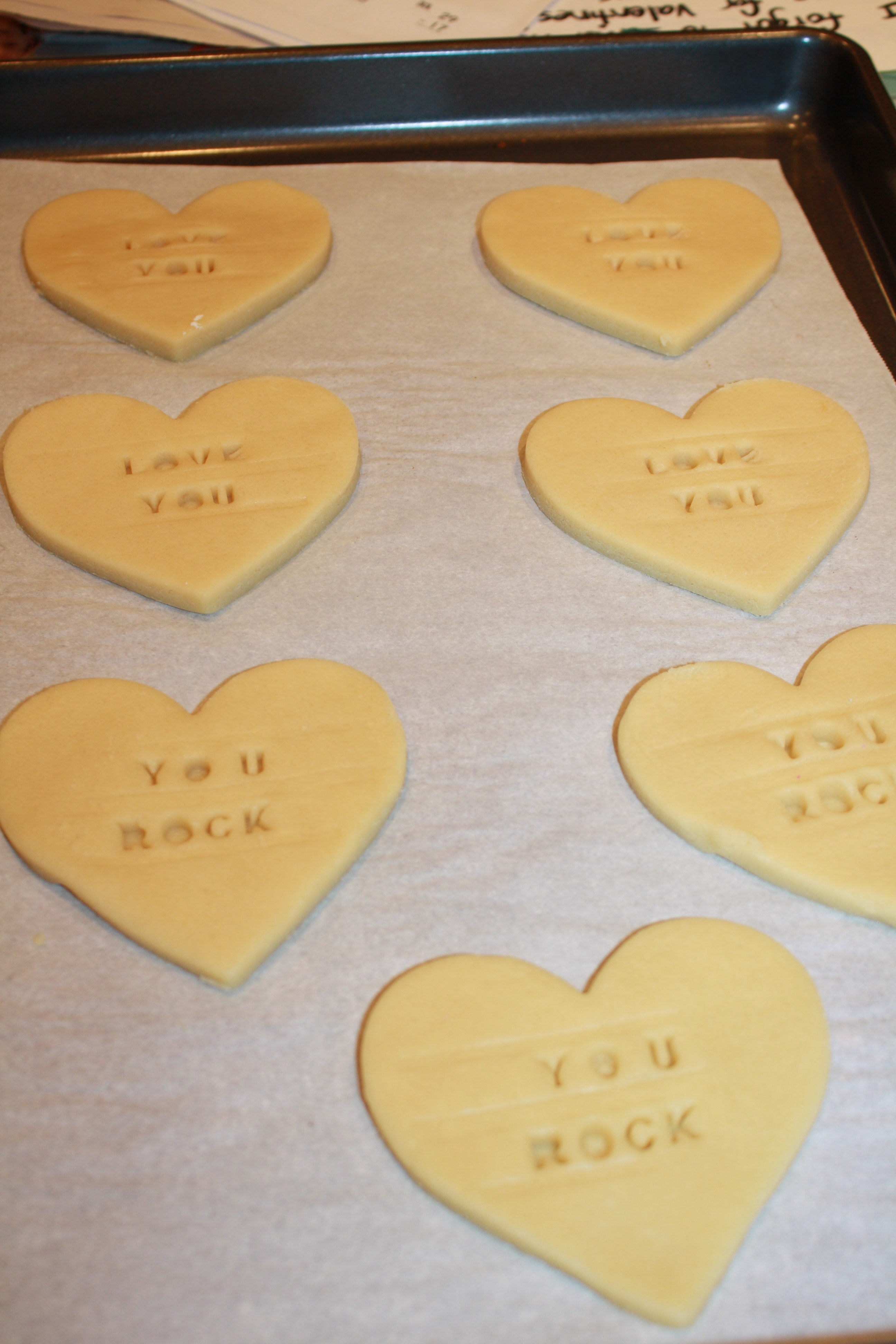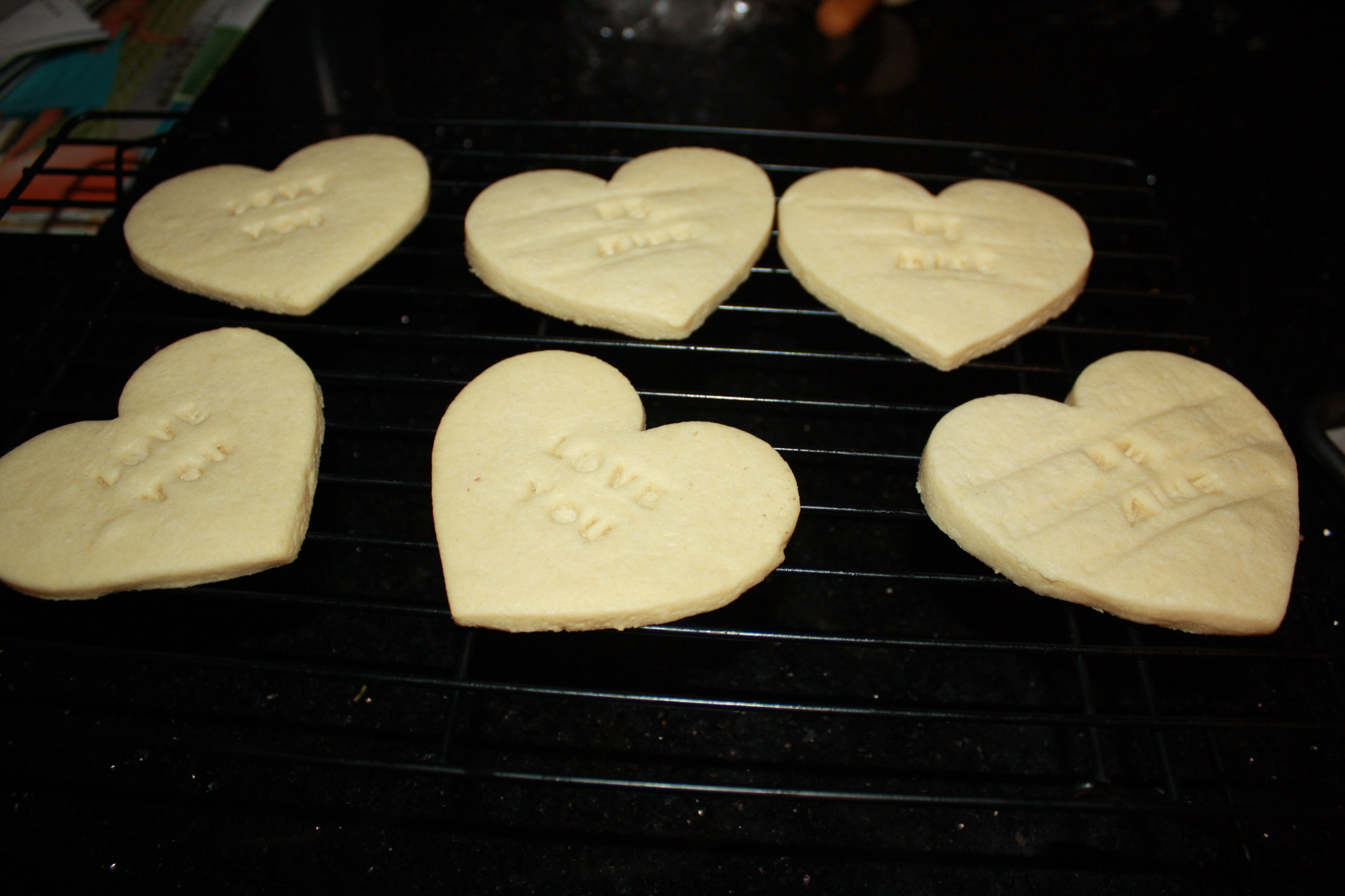 Then I used the edible marker to write the sayings on the hearts, but this was difficult with those indentations because in those places, the glaze was weaker, so the pen often broke the surface of the icing. I think if it hadn’t done that, the writing would have been a lot more legible. Maybe I should have used an icing writer instead…