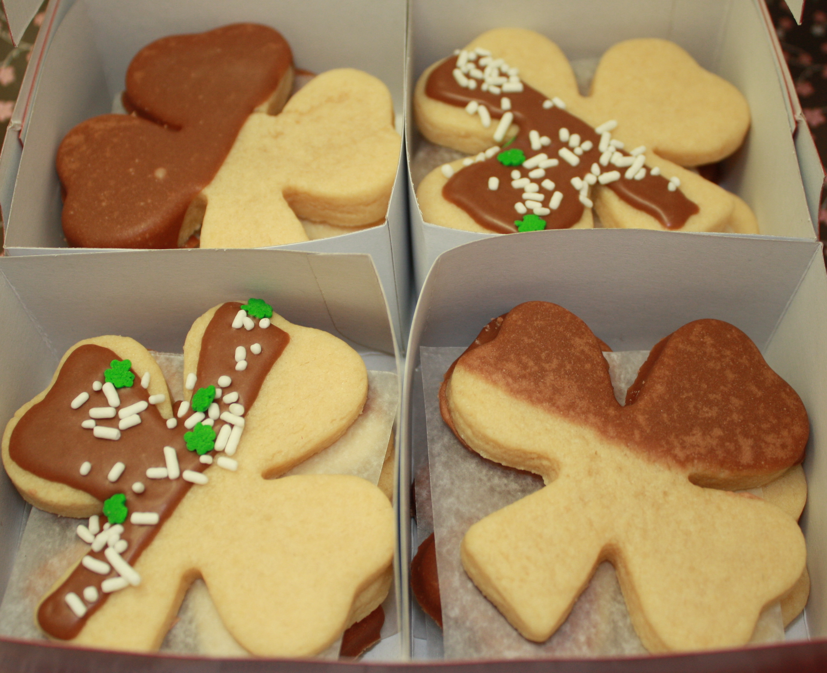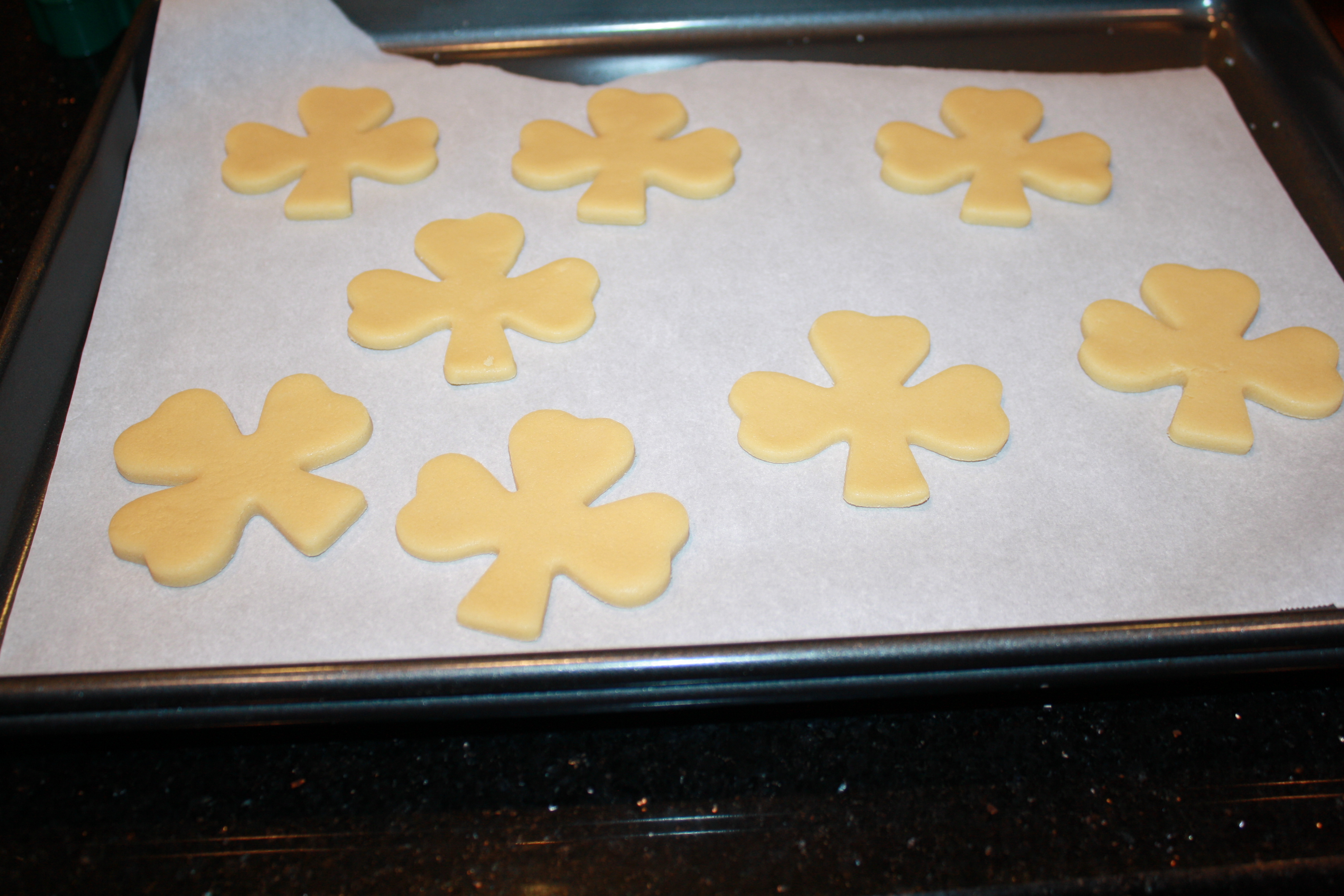 - Roll out dough & cut out cookies using a shamrock cookie cutter.